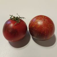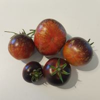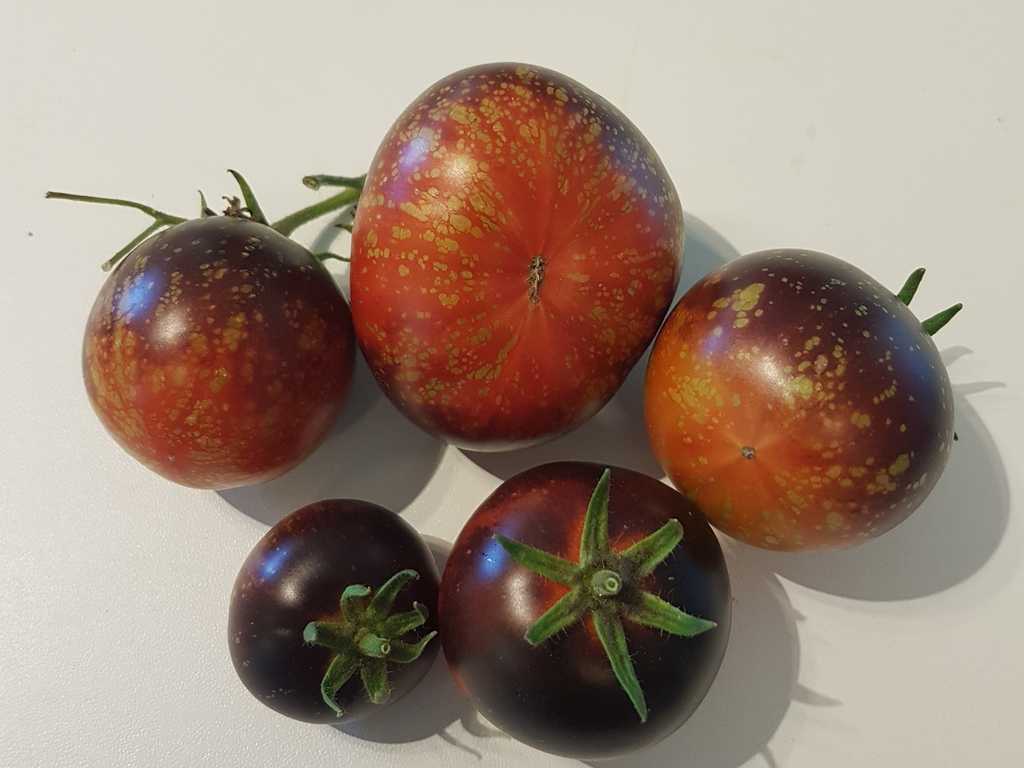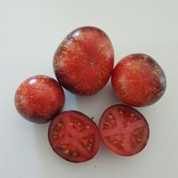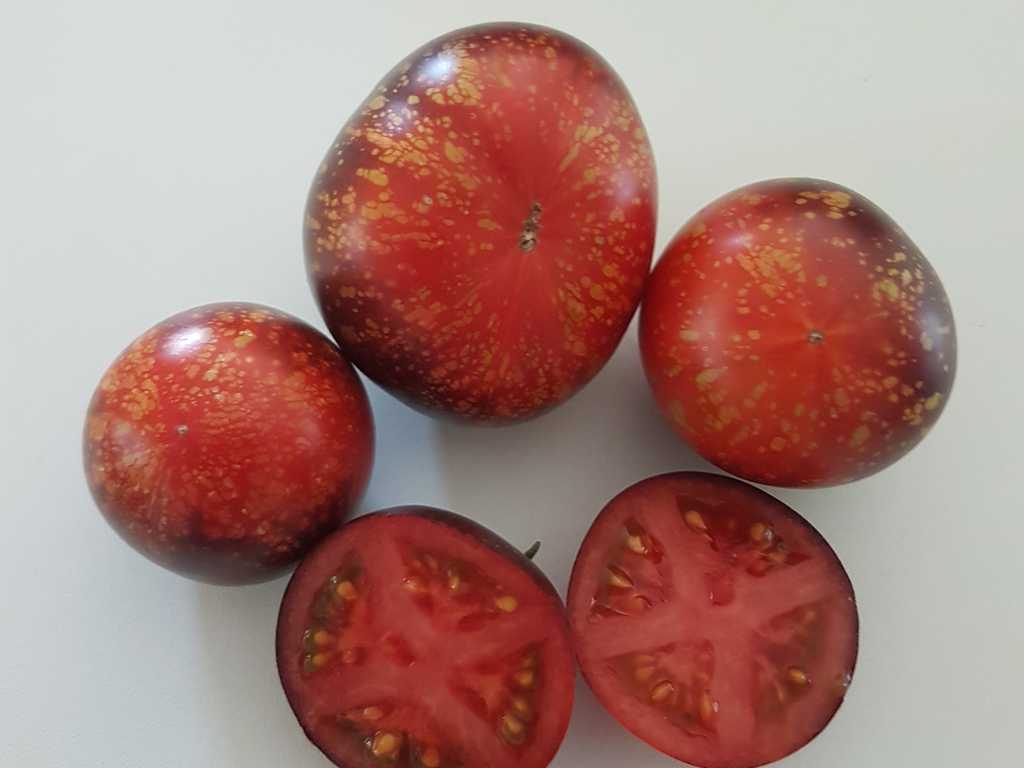 En av de mest fantastiska och unika tomaterna. En sällsynt produktiv sort från Kalifornien i en mycket speciell färg. Mycket kraftfulla växter, sjukdomsresistenta, växer upp till 180 cm. Frukten har en vikt på 85-100 gram. Omogna frukter börjar grönt med lila antocyanin snedstreck och lila fläckar. Den är så vacker och god! Läckra frukter med saftiga och balanserade smaker.
