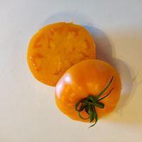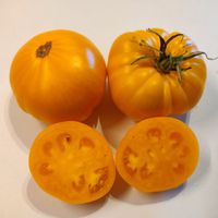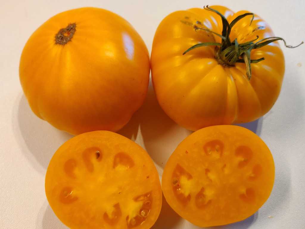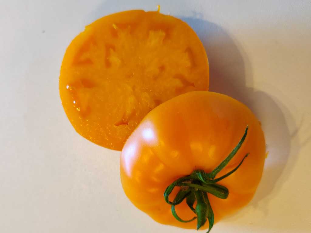Stor frukt av bifftyp som väger 250 till 500 gram, rund och mer eller mindre tillplattad med fylliga och räfflade axlar. Blek orange matt skal som påminner om färgen på en orange sorbet (därav dess namn)! Saftigt fruktkött. Välbalanserad söt smak med en hint av syra. Bra produktion fram till frost. Bra motstånd mot sprickbildning. Tetra cis-lykopen - 5,36