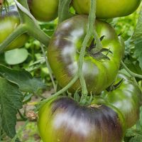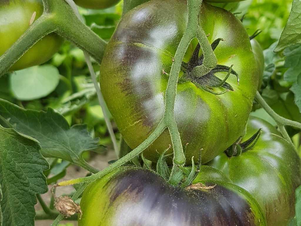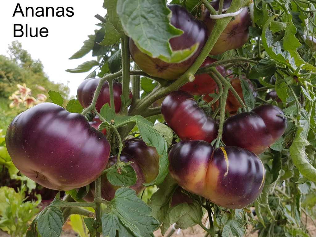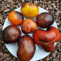 Platt-runda frukter väger 150-250g, 1,5 - 1,8 m hög planta. Gul skinn färg går över till röd vid riktig mognaden, med brun-lila anthocyanin axlar. Saftig sur-söt fruktig smak.
