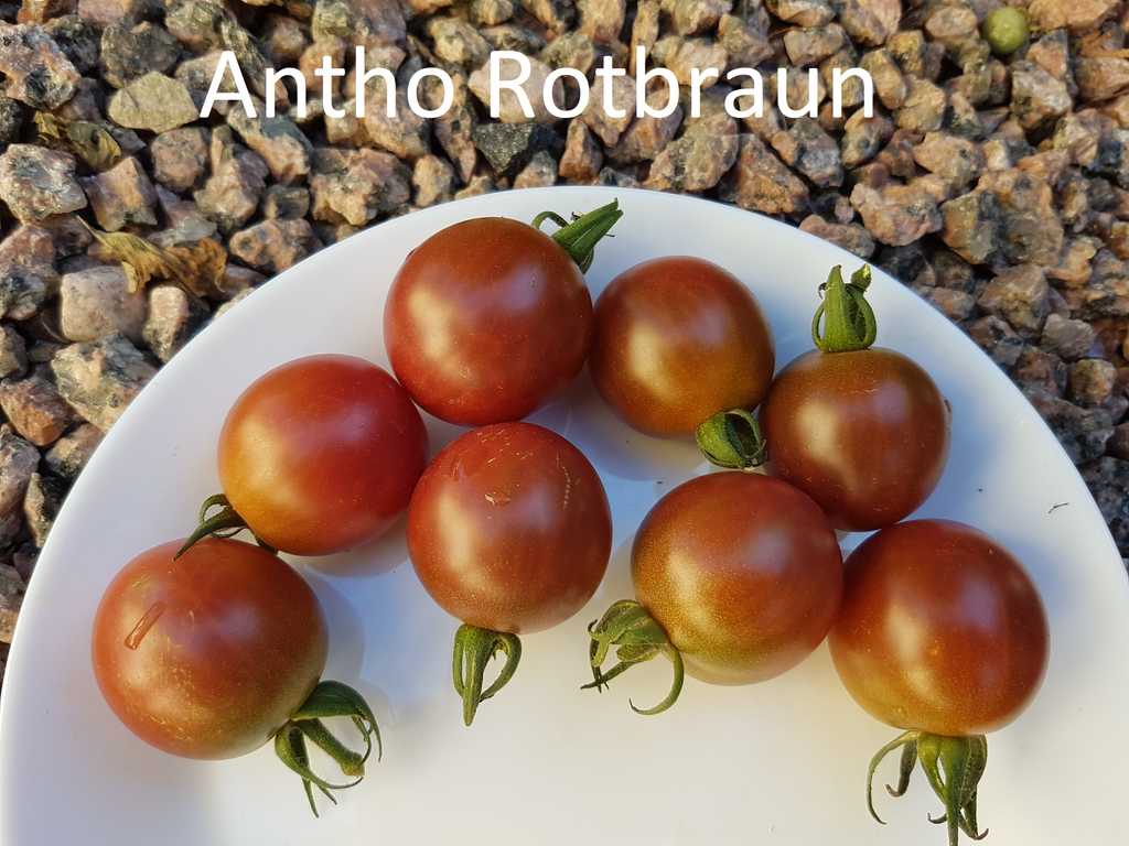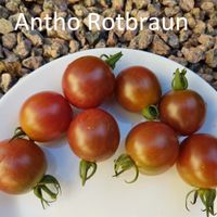 Choklad-bruna frukter, som är lite större än vanlig cherry. Tomaterna är saftiga och har en riktigt härlig smak, mer syrliga än söta men jätte goda! Antho Rotbraun ger riktigt hög avkastning.