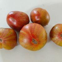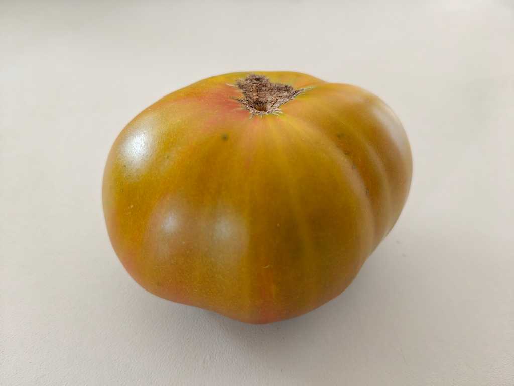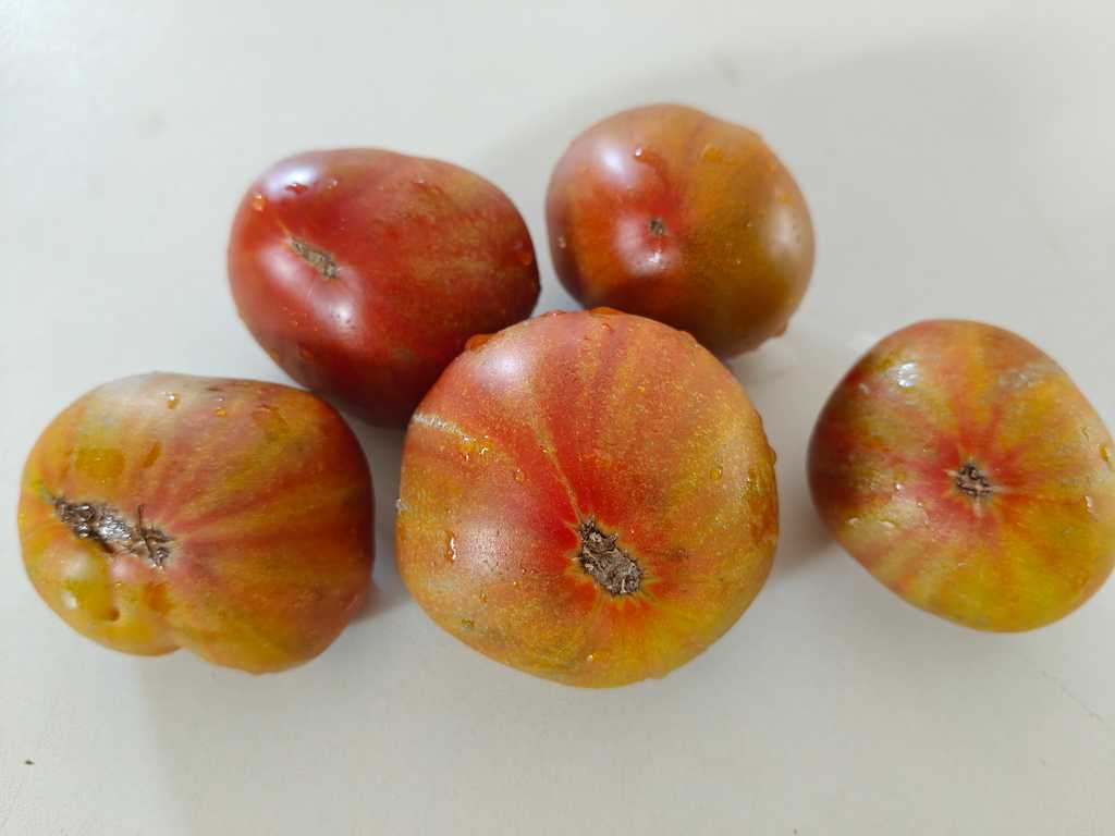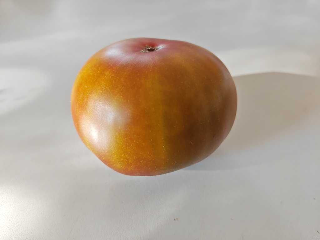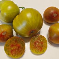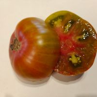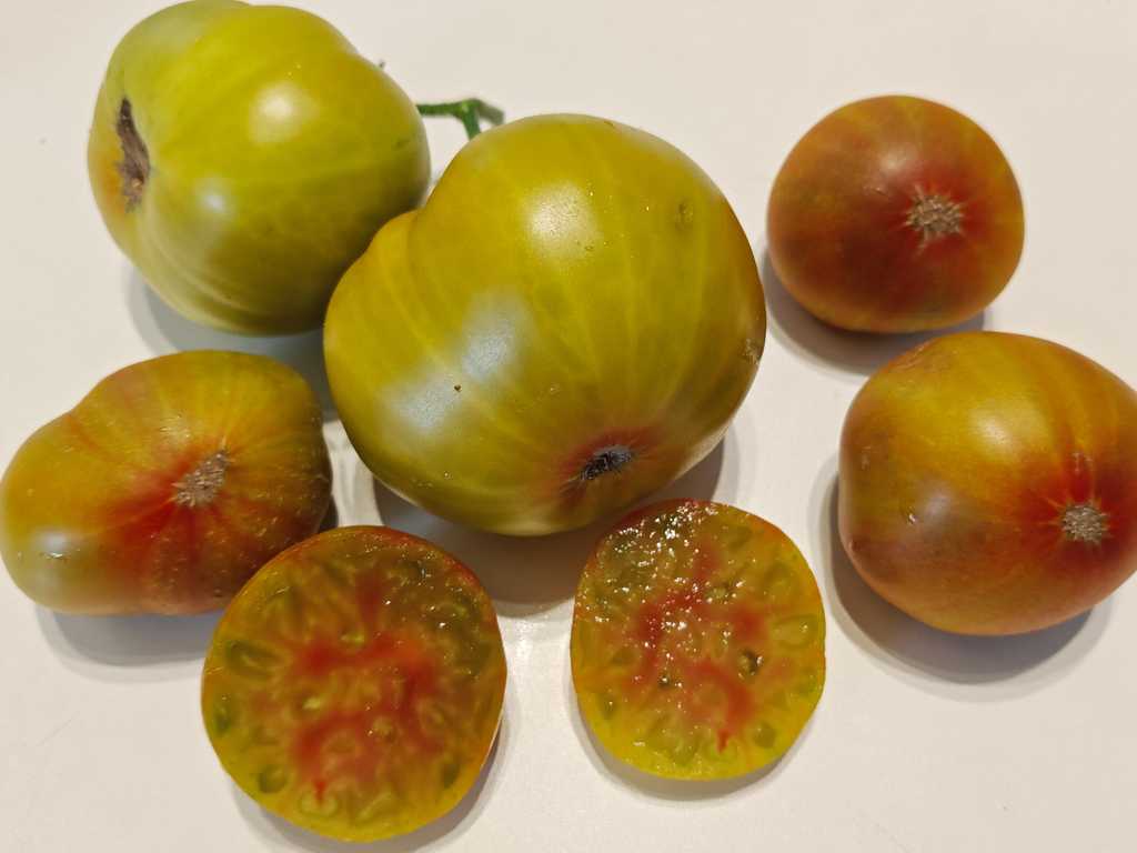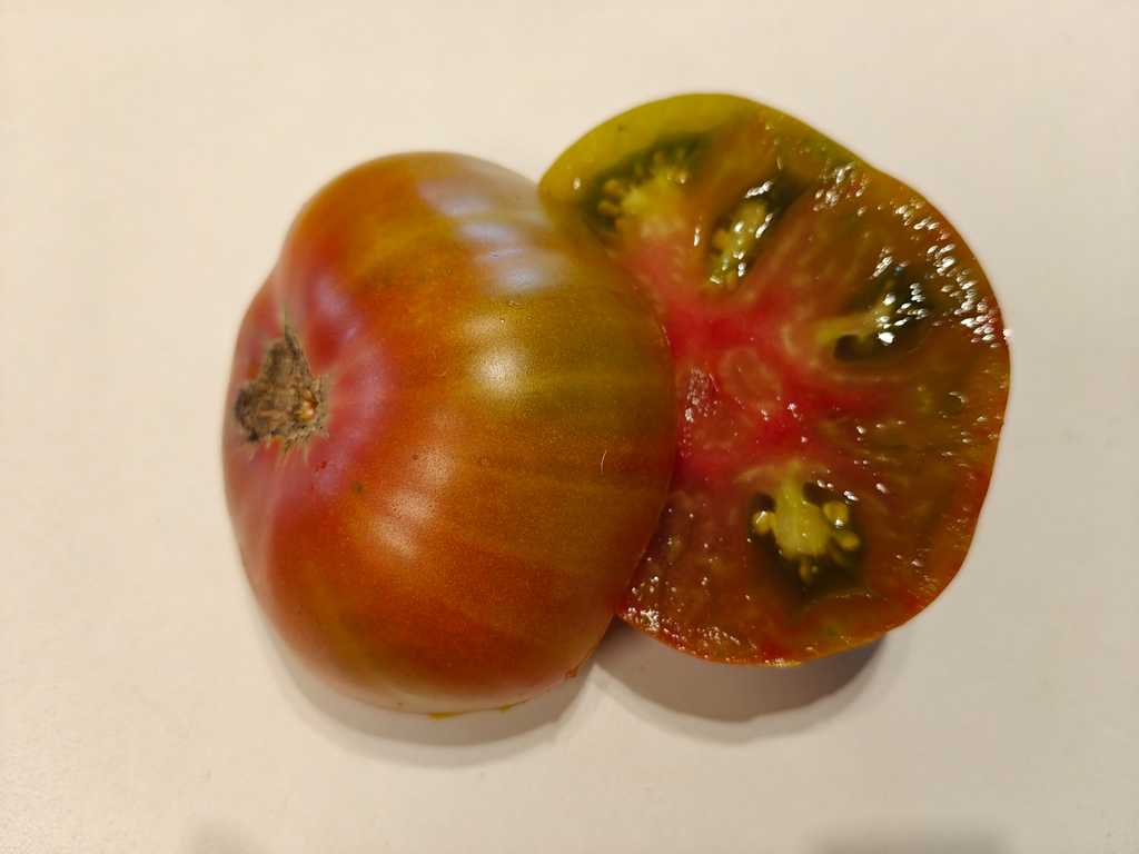 Det är en tomat med ett väldigt unikt utseende. Skalet är tegelfärgat och insidan är grön med rosa-gula toner. Smaken är mycket intressant med söta toner och en rökig eftersmak, väldigt balanserad och intressant.
