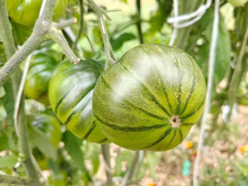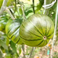 Arbuznyj betyder Vattenmelon tomat. Stora frukter är mörkrödgröna till färgen, halvrandiga (ränderna börjar vid stjälken och är arrangerade vertikalt). Omogna frukter är grönaktiga, men uppvisar också det karakteristiska sortmönstret. Fruktköttet är ganska köttigt, men ändå mört och måttligt saftigt. Smaken är livfull med söta, exotiska toner.