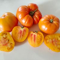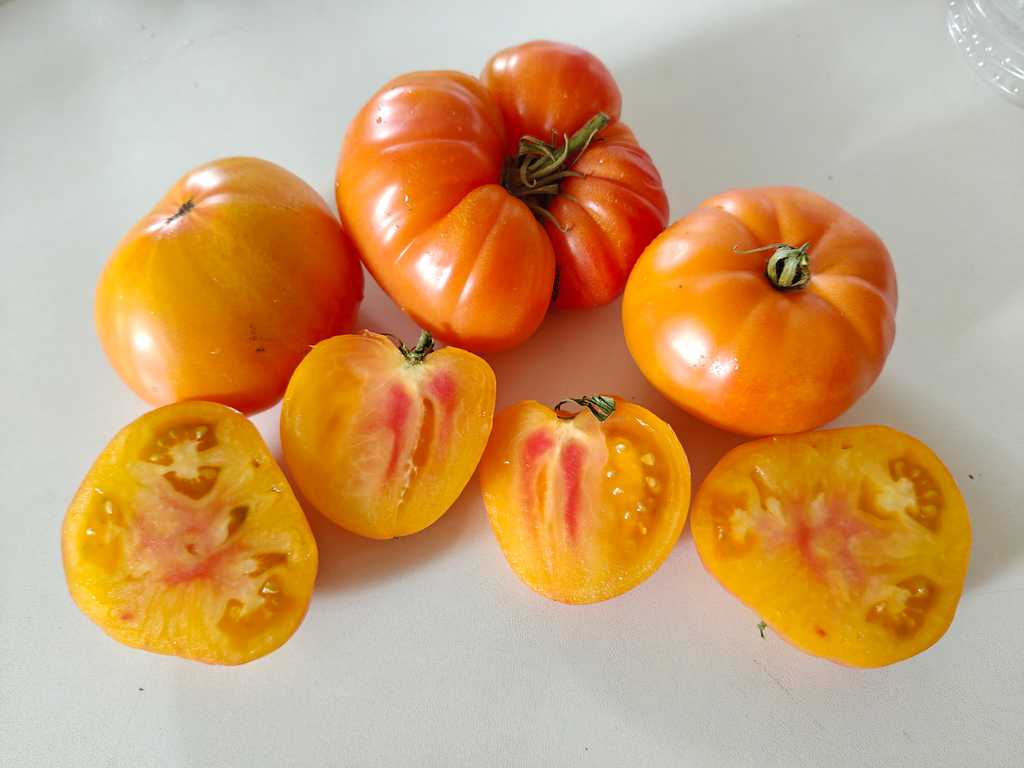 1,8 m hög planta producerar stora plattrunda bi-color frukter, i början mogna tomater är gula, sen börjar få röd färg mer och mer. Fruktkött är orange med rosa i mitten, har god fruktig smak.