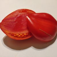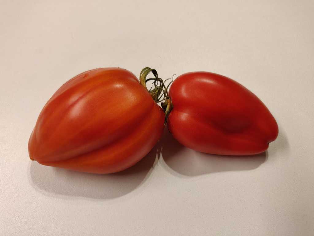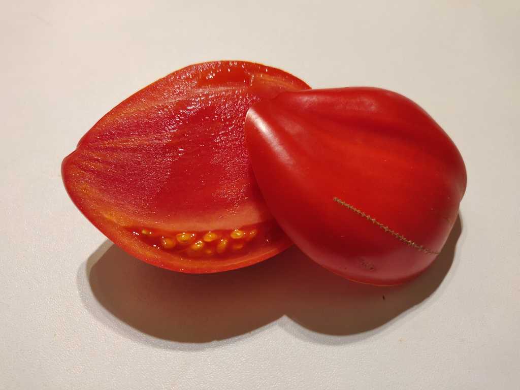 Stor röd frukt, 200-300 gram, oregelbundet formad med hjärtformad tendens, väl markerad ribb i toppen och vågiga axlar. Mycket köttigt, tjockt och lagom saftigt fruktkött med mycket små fickor som innehåller mycket få frön. Utmärkt söt smak. Skalet lossnar väldigt lätt och kommer att vara ett mycket bra val för att göra sås eller coulis.