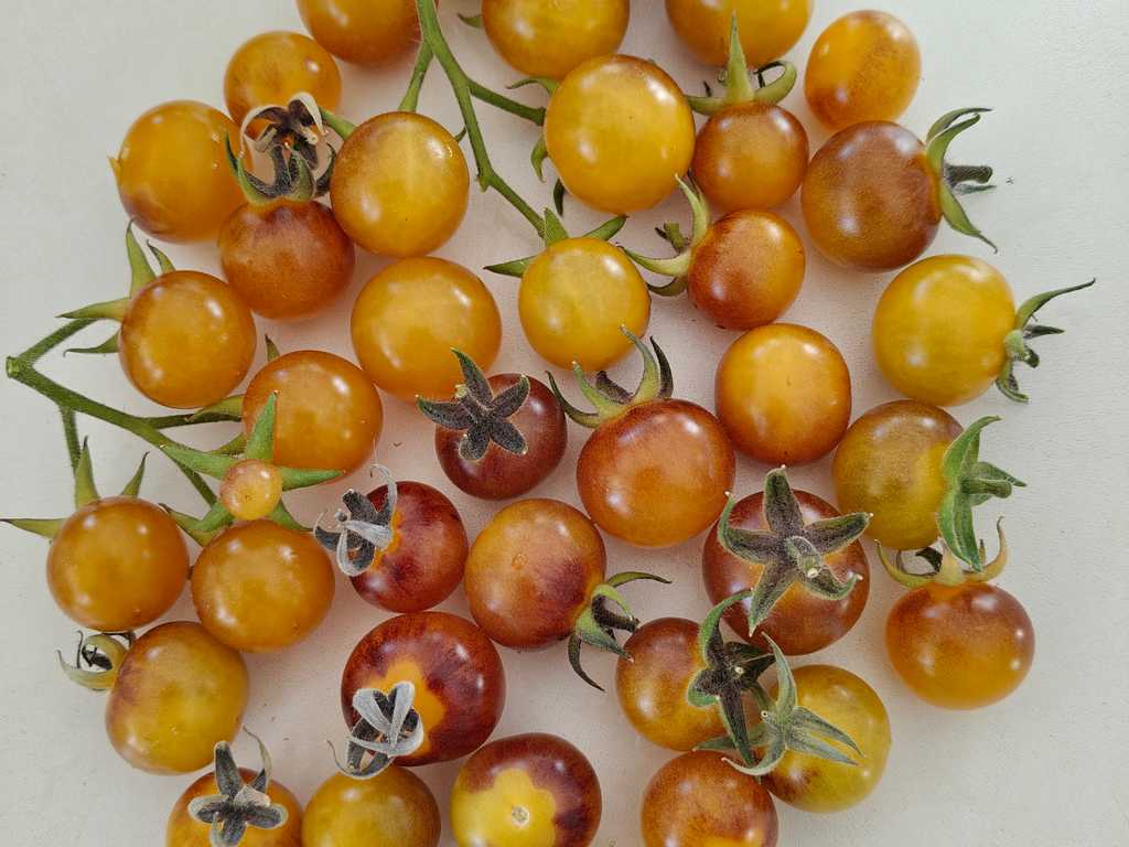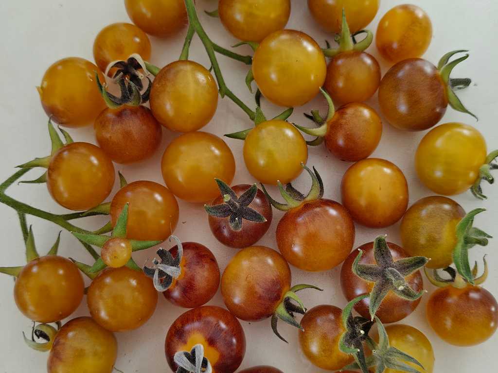 Runda körsbärstomater i klasar om cirka 12 frukter. Lila ametistfärgat skal som blir gyllene vid full mognad. Stora indigoblå fläckar, särskilt på toppen av frukten. Mycket fin visuell effekt! Mycket stark sort, bra motståndskraft mot fuktigt och svalare väder. Supersöt, utmärkt tomatsmak.