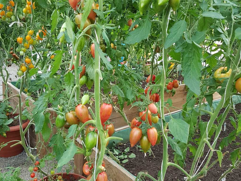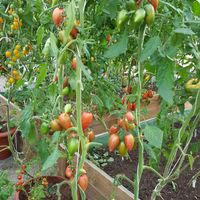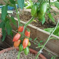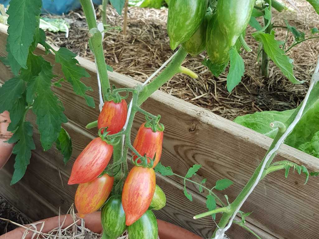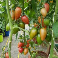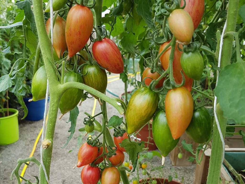 En exotisk, droppformad tomat med vilda ränder av guld. Frukt mognar till rosa-röd och har en utsökt söt, rik smak. Ovanligt och väldigt coolt! 1,5m hög.