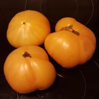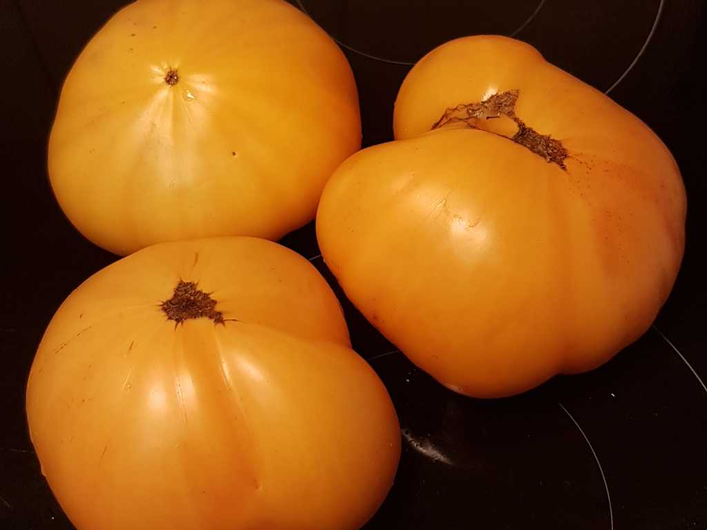 Orange biff frukter med mycket köttigt kött och små frökamrar. Enastående söt smak. Det är ganska tidigt jämfört med andra orange biff tomat sorter.