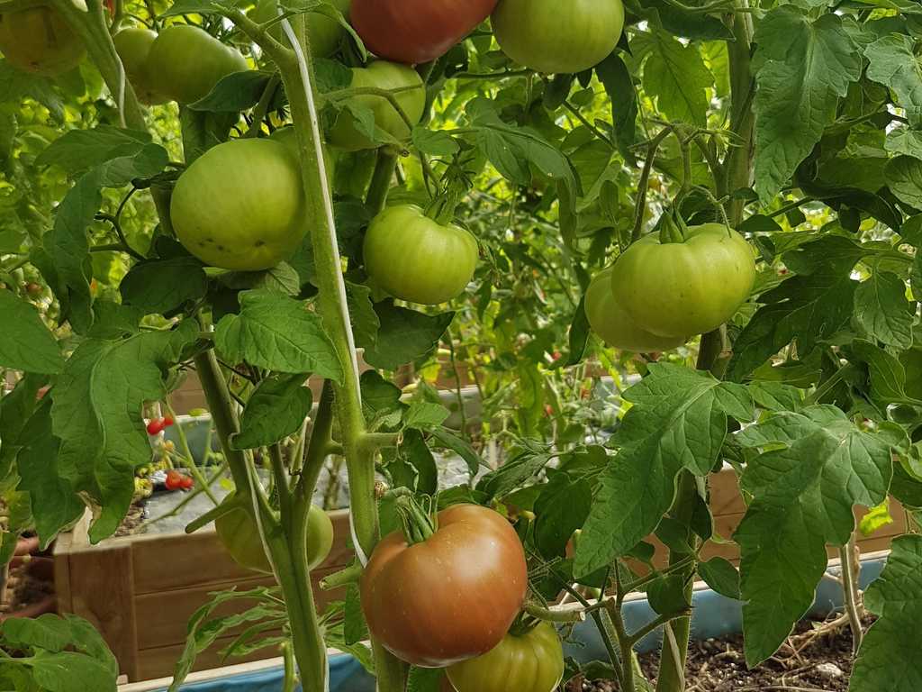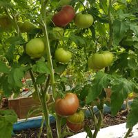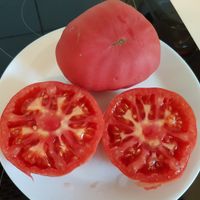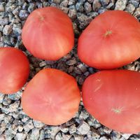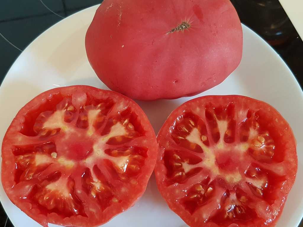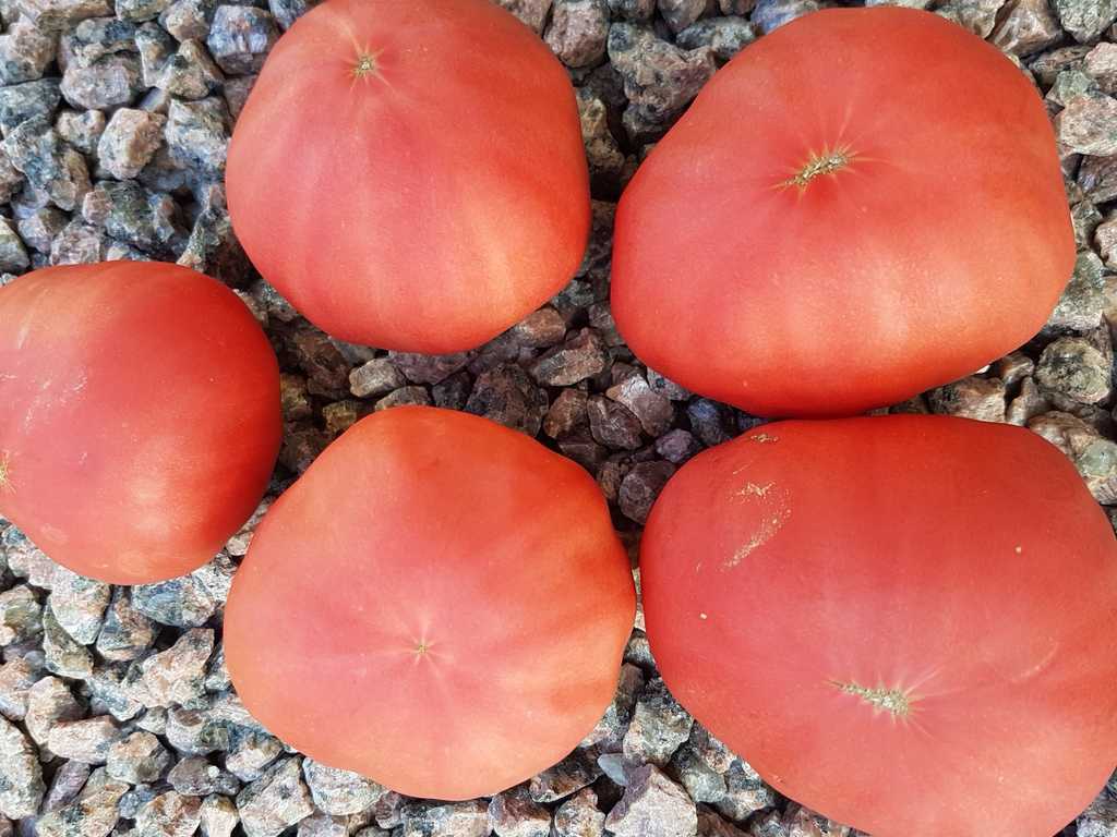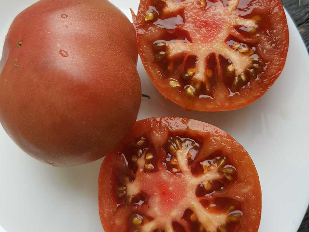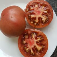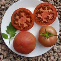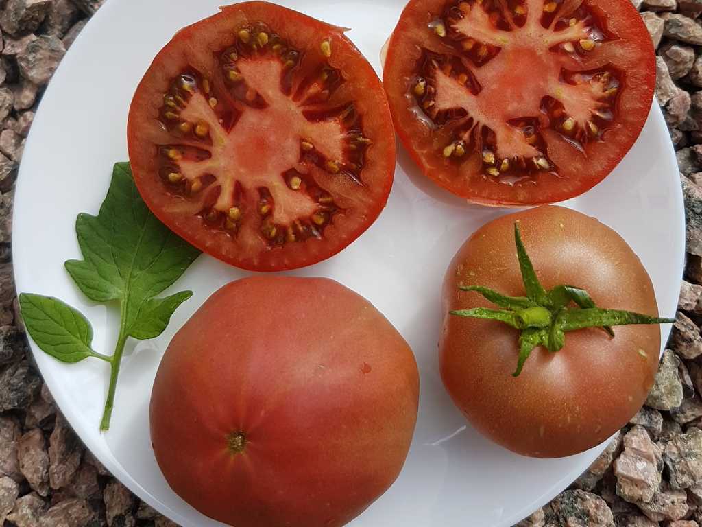 Platta runda frukter med en speciell dimmig mattrosa färg. Fruktvikt i genomsnitt 150 - 200 gram. God smak ärvt från sin förfader "Cherokee Purple", rik och söt. Mycket höga utbyten från mitten av säsongen.