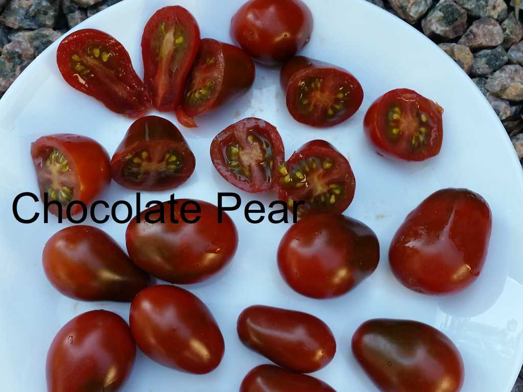 Denna päronformade körsbärstomat är en kombination av rött med ett överlägg av både gröna och bruna nyanser. Den har en rik tomatsmak, lite syrlig, lite söt, som är utmärkt för att lägga till sallader, pasta eller till och med bara för att äta direkt från buske.