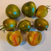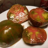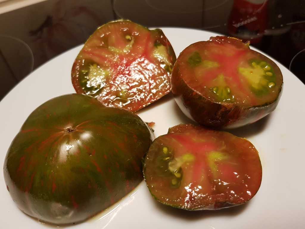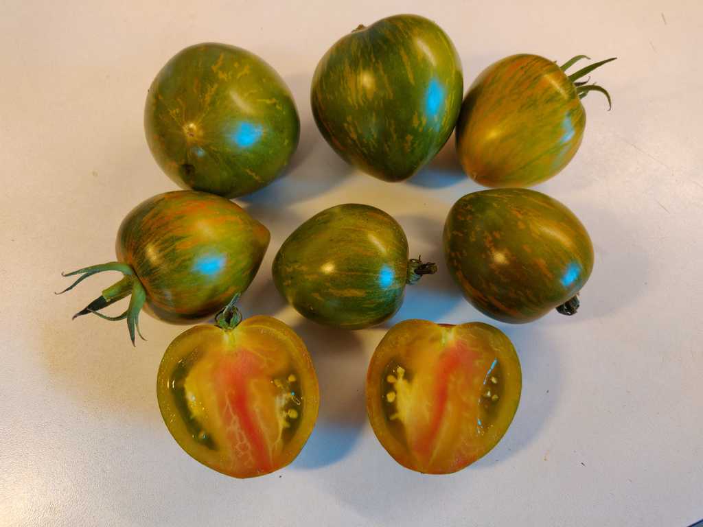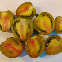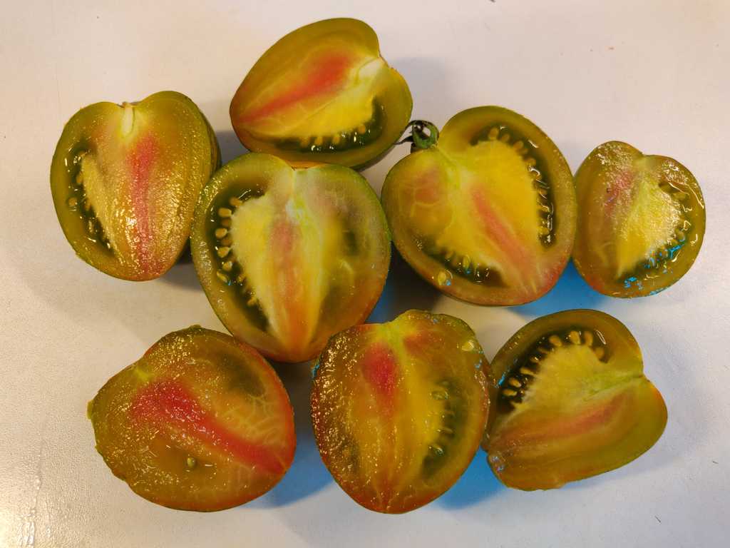 2 m hög planta ger lätt hjärtformade, medelstora frukter. Vackra brungrön-gulrandiga frukter. Rosa och grönt kött, med utmärkt smak.