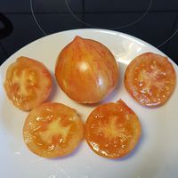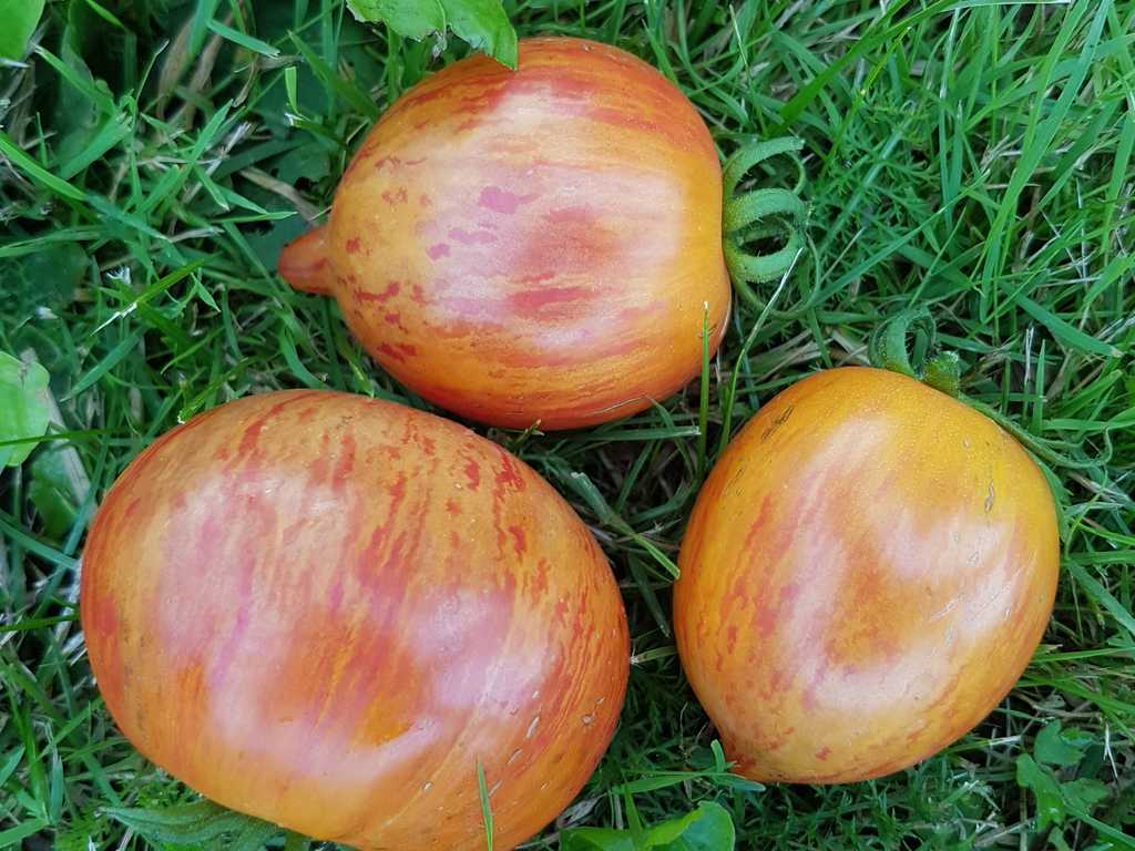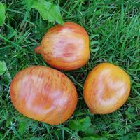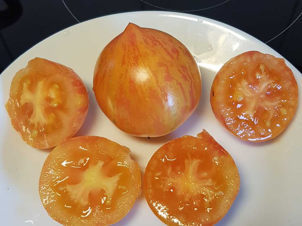 Runda tomater med en uttalad bröstvårta längst ner. Genomsnittlig fruktvikt 75 till 150 gram. Pastell orange gul skin, strimmig med rött. Måttligt gröna sporer på den övre halvan. Saftig orange-gul fruktkött med lite rosa marmorering. Utmärkt smak, toppnivå.