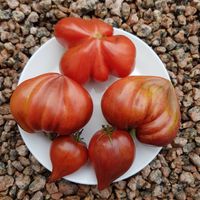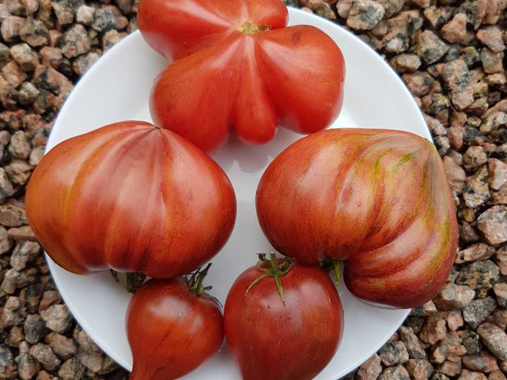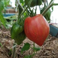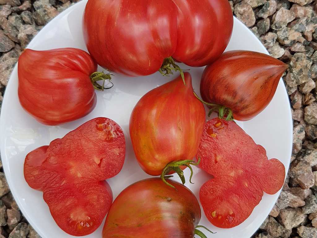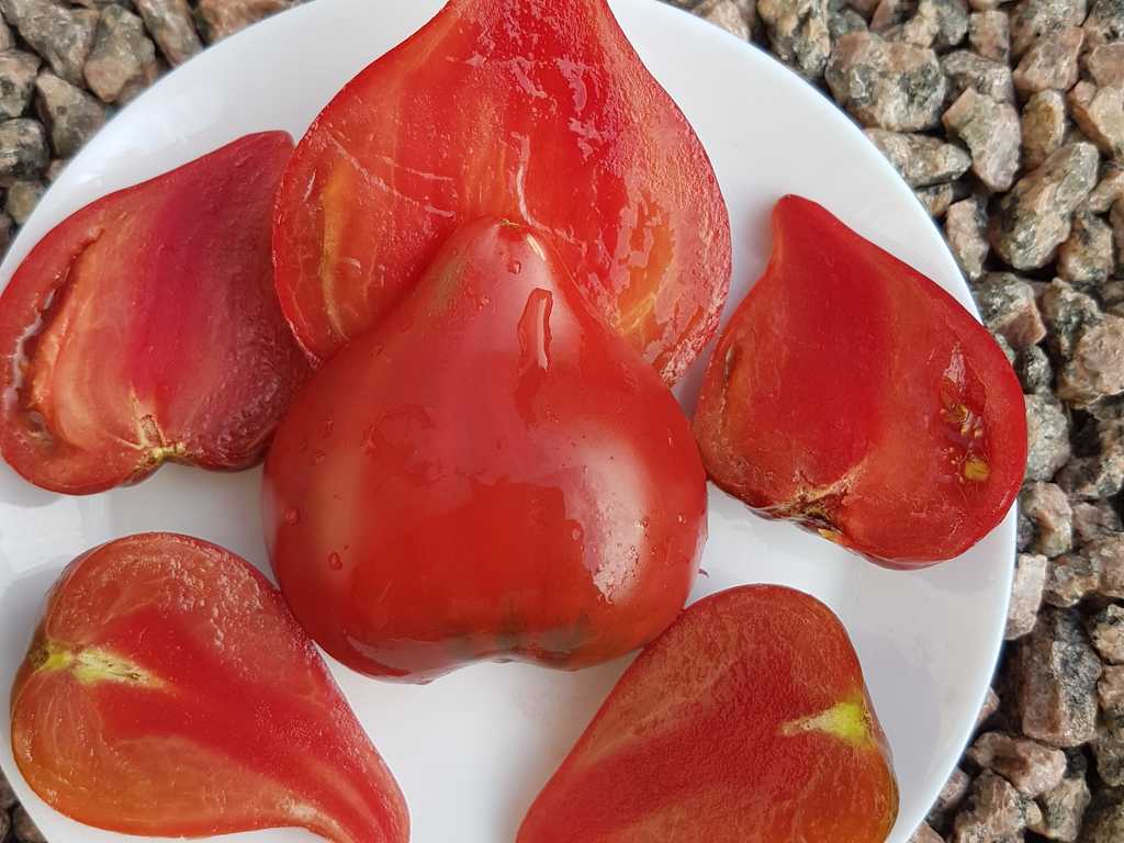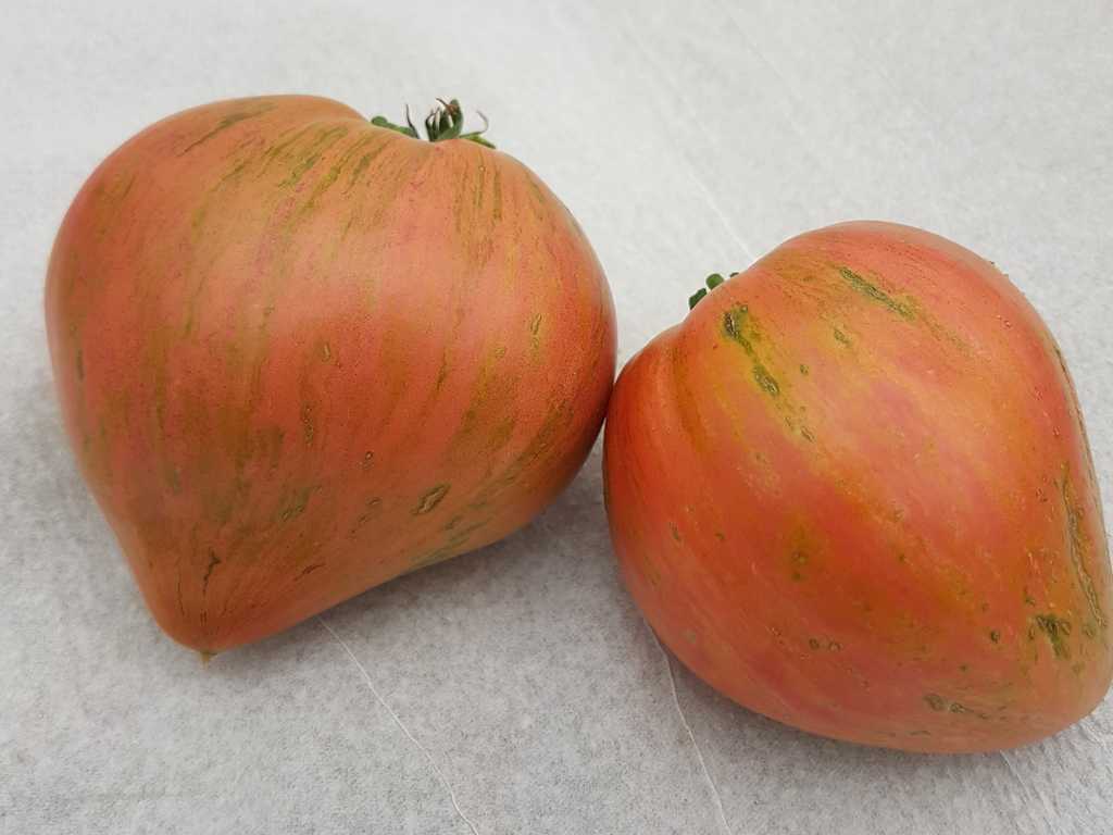 Medeltidig. Frukt väger 120-180 gram, hjärtformad som verkligen är hjärtformad, mycket köttig och mycket spetsig eller till och med hakad! Färg: nyanser av ljusrosa till mörkrosa understrukna av gröna streck med spår av antocyaniner, särskilt synliga vid axlarna. Tätt kött med små celler, utsökt smak.