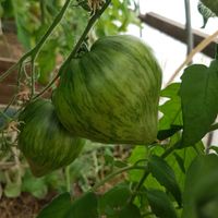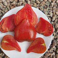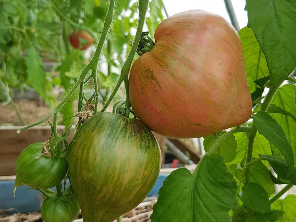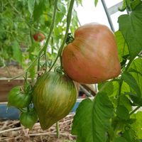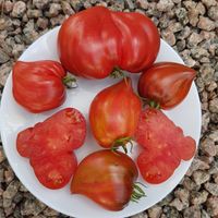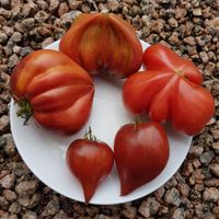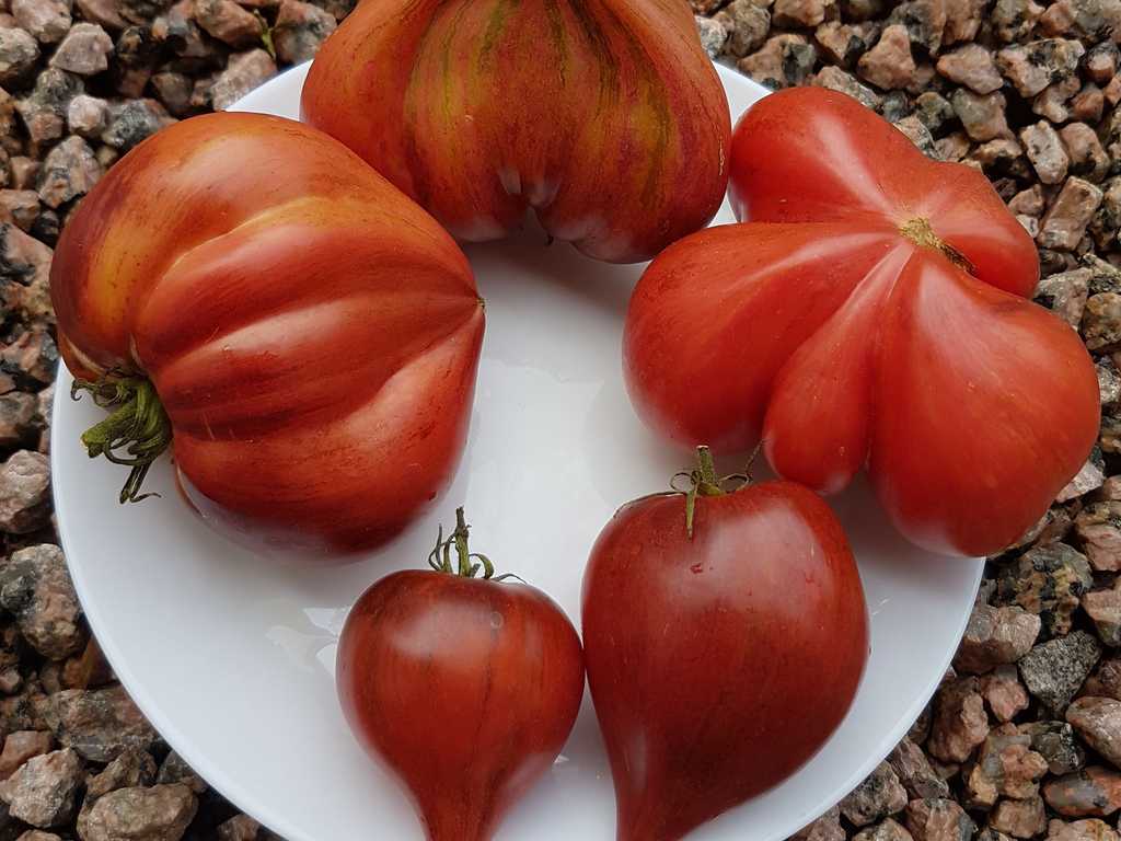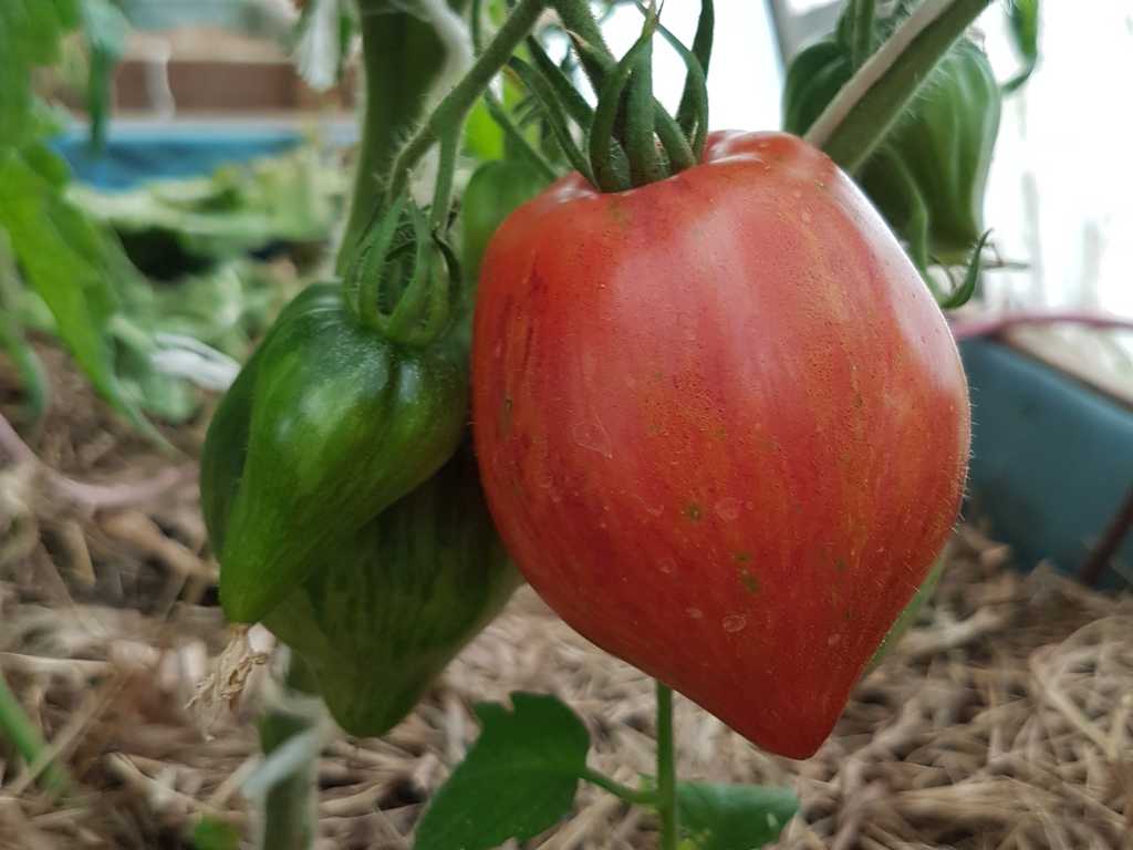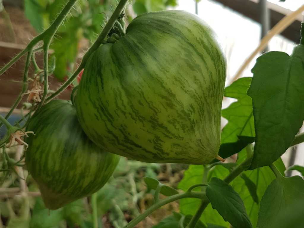 Medeltidig. Frukt väger 120-180 gram, hjärtformad som verkligen är hjärtformad, mycket köttig och mycket spetsig eller till och med hakad! Färg: nyanser av ljusrosa till mörkrosa understrukna av gröna streck med spår av antocyaniner, särskilt synliga vid axlarna. Tätt kött med små celler, utsökt smak.