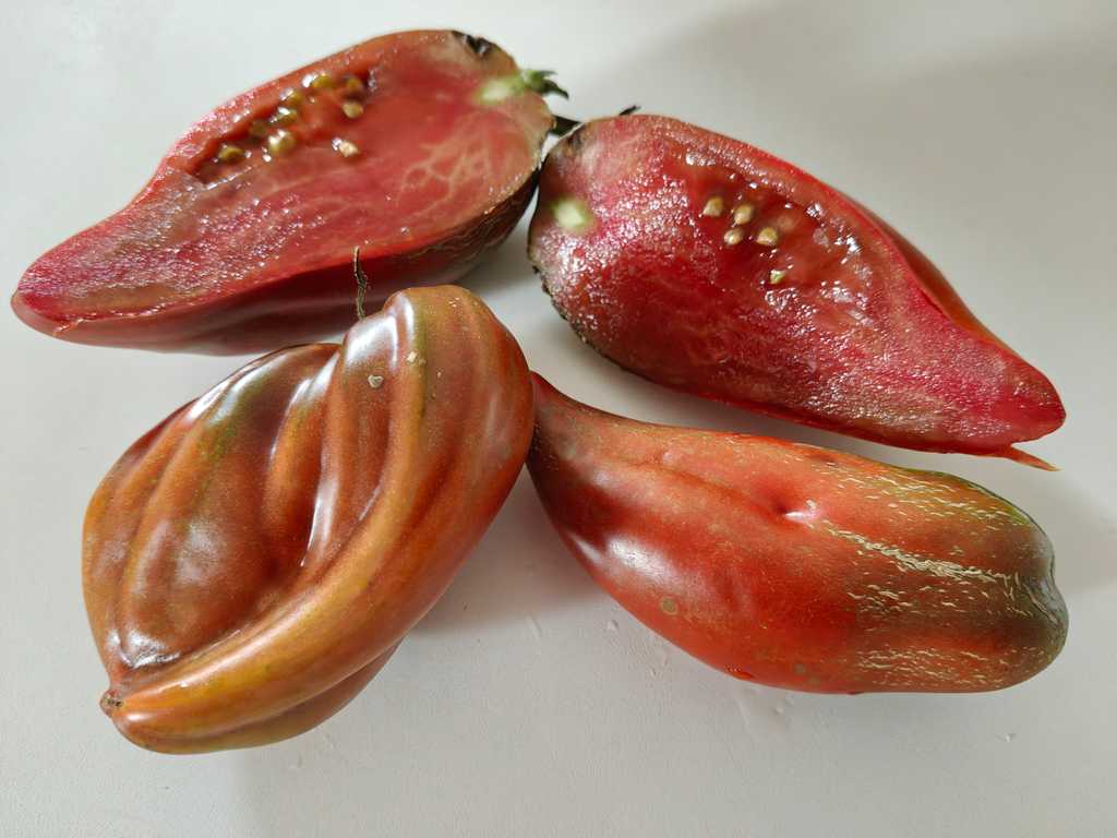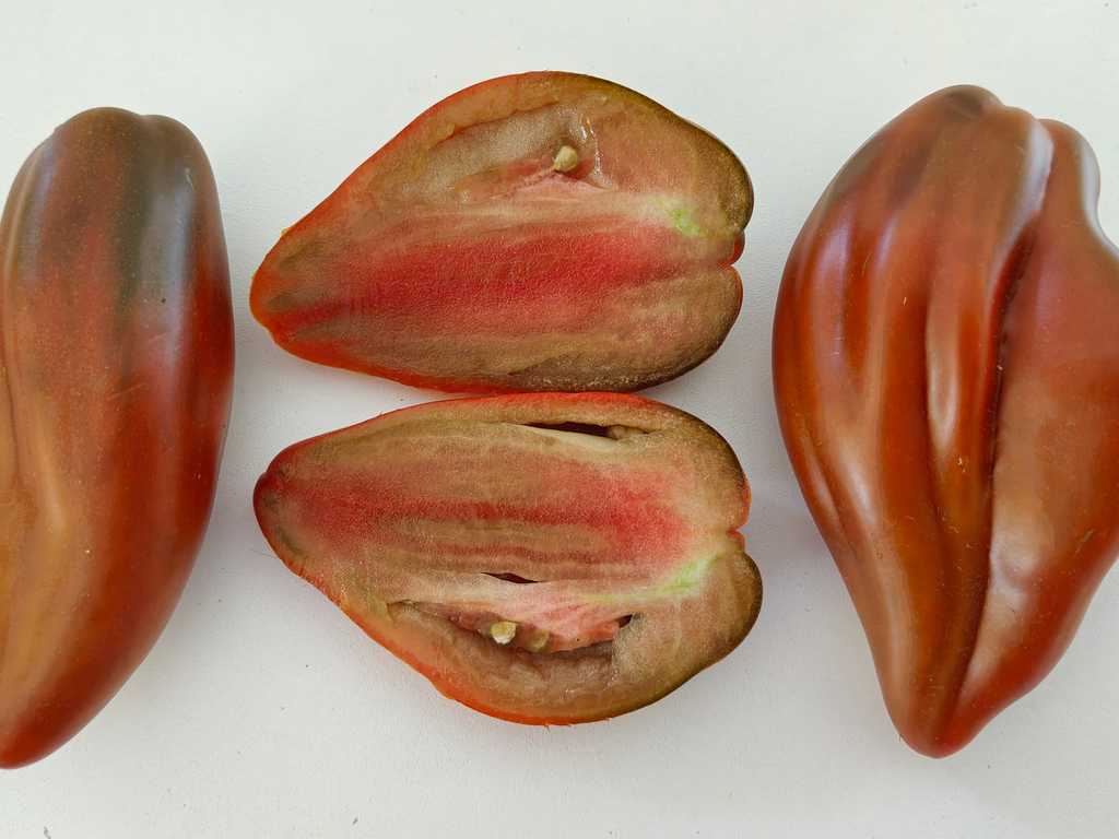 Brun tomat som liknar paprika, roliga former, svårt att hitta 2 lika tomater i form. Det är en pastasort, köttig med lite frö och därför bra för såser. Smaken är god, välbalanserad syra och sötma. Mycket produktiv, frukt vikt 150-200 g.