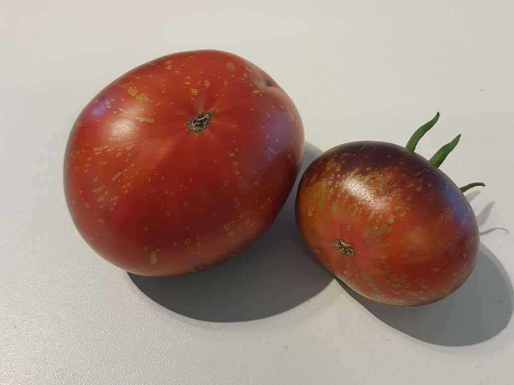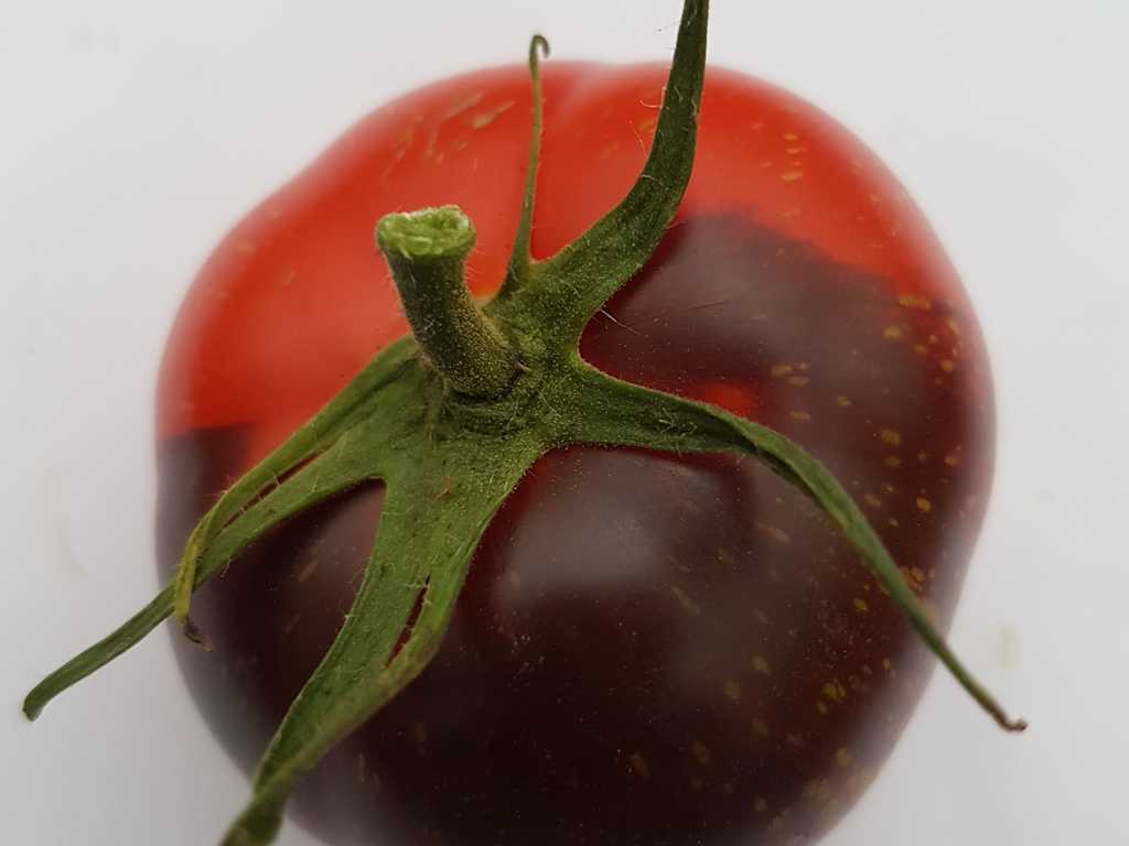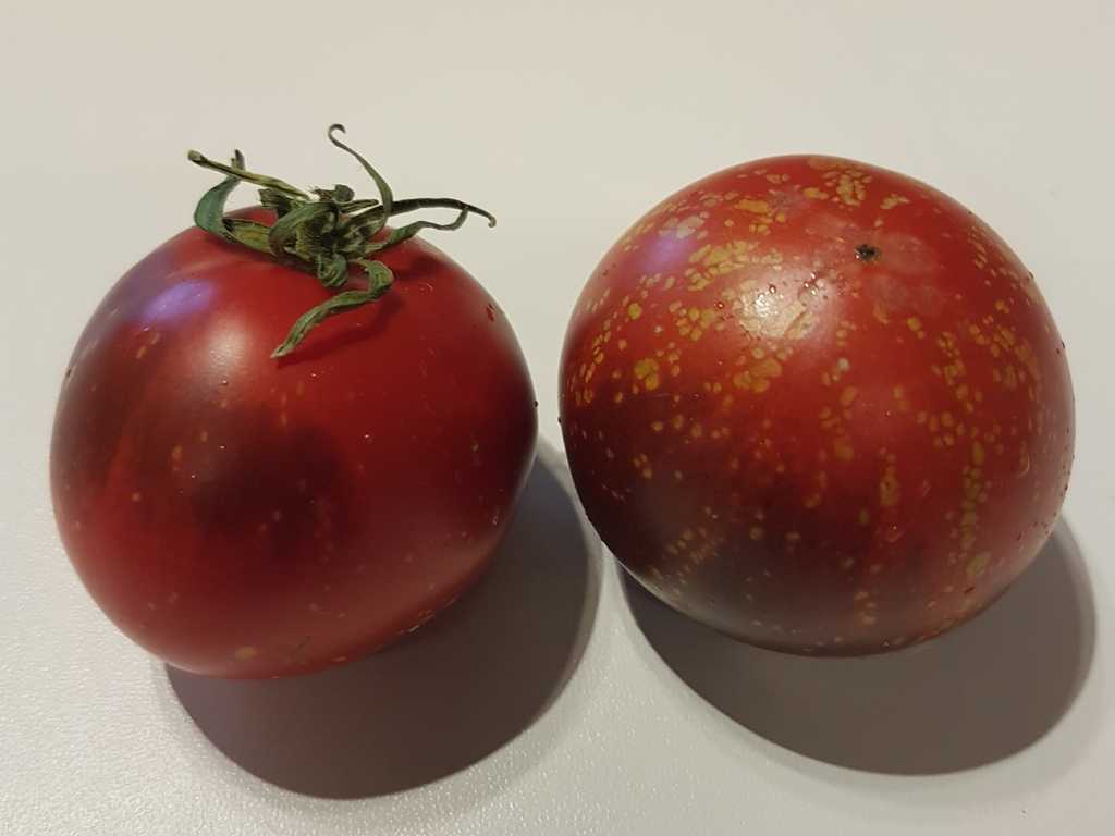 En av de mest fantastiska och unika tomaterna. En sällsynt produktiv sort från Kalifornien i en mycket speciell färg. Mycket kraftfulla växter, sjukdomsresistenta, växer upp till 180 cm. Frukten har en vikt på 85-100 gram. Omogna frukter börjar grönt med lila antocyanin snedstreck och lila fläckar. Den är så vacker och god! Läckra frukter med saftiga och balanserade smaker.