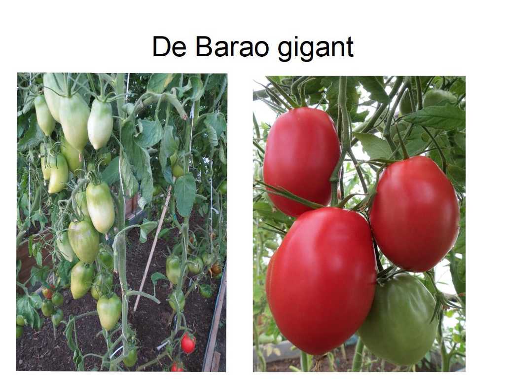 Tålig sort. Köttig och saftig frukt, 150-300g, mycket söt smak med lite sura. På grund av detta blir tomater av sorten de Barao Giant ofta den viktigaste ingrediensen i sommarvitaminsallader, ketchup, juice och såser för den kalla årstiden.