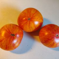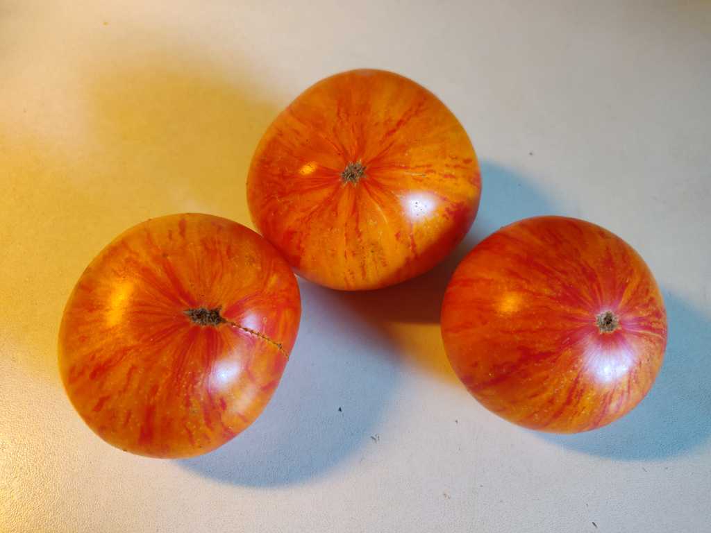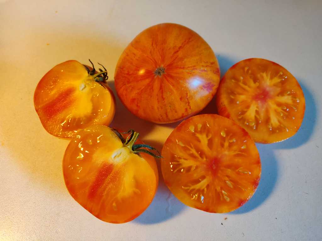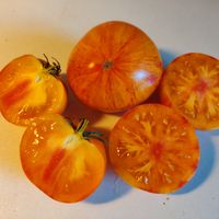 Otroligt vacker och väldigt söt och god bifftomat. Gula med rosa och gyllene färg, även på fruktköttet. Ganska stora frukter på 200-350 gram och ger stor skörd. Höjd ca 100 cm.