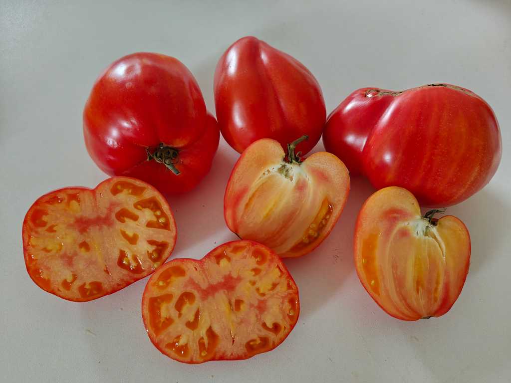 Trädliknande växt 1,2m hög. Frukt 150-350 gram rund med hjärtformad tendens. Tvåfärgad, gul färg med en rosa-röd rodnad vid mognad. Fruktmassan är tät och saftigt. En av de mest doftande och fruktiga dvärgsorterna.