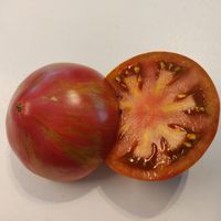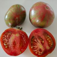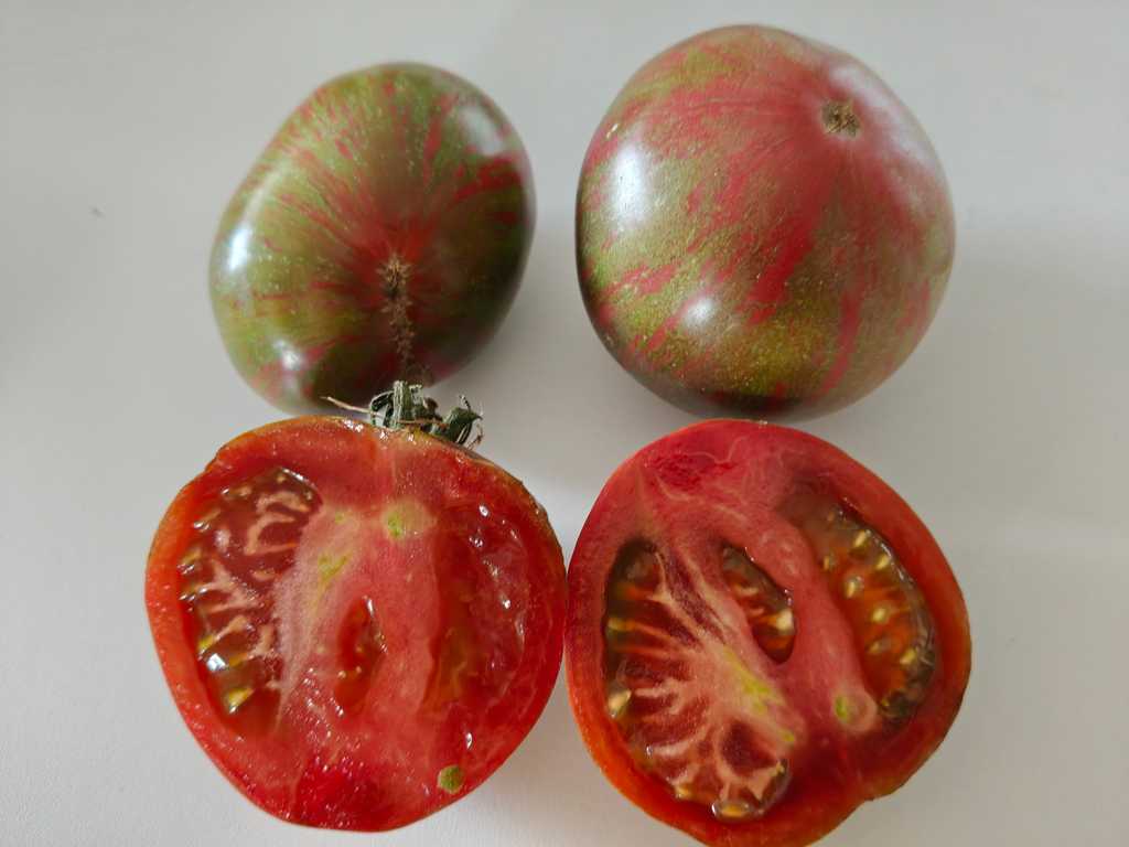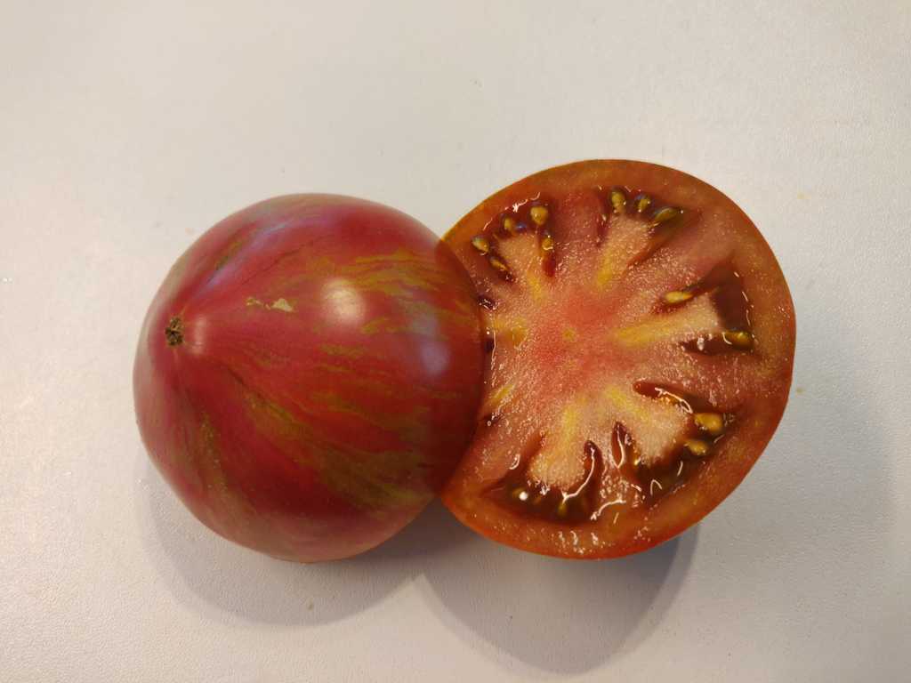 Kompakt trädliknande växt på +/- 1,20 m hög. Frukt av 150 till 300 gram oxbifftyp med varierande form, ibland tillplattad, ibland med en lätt hjärtformad tendens. Rött skal, randig med metalliskt grönt. Köttigt fruktkött med en rik och välbalanserad smak, något söt och syrlig.