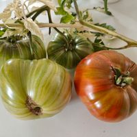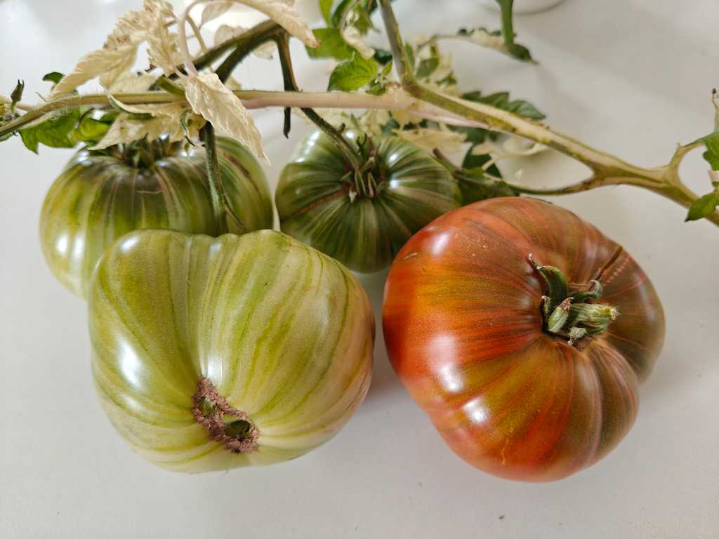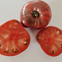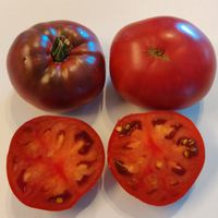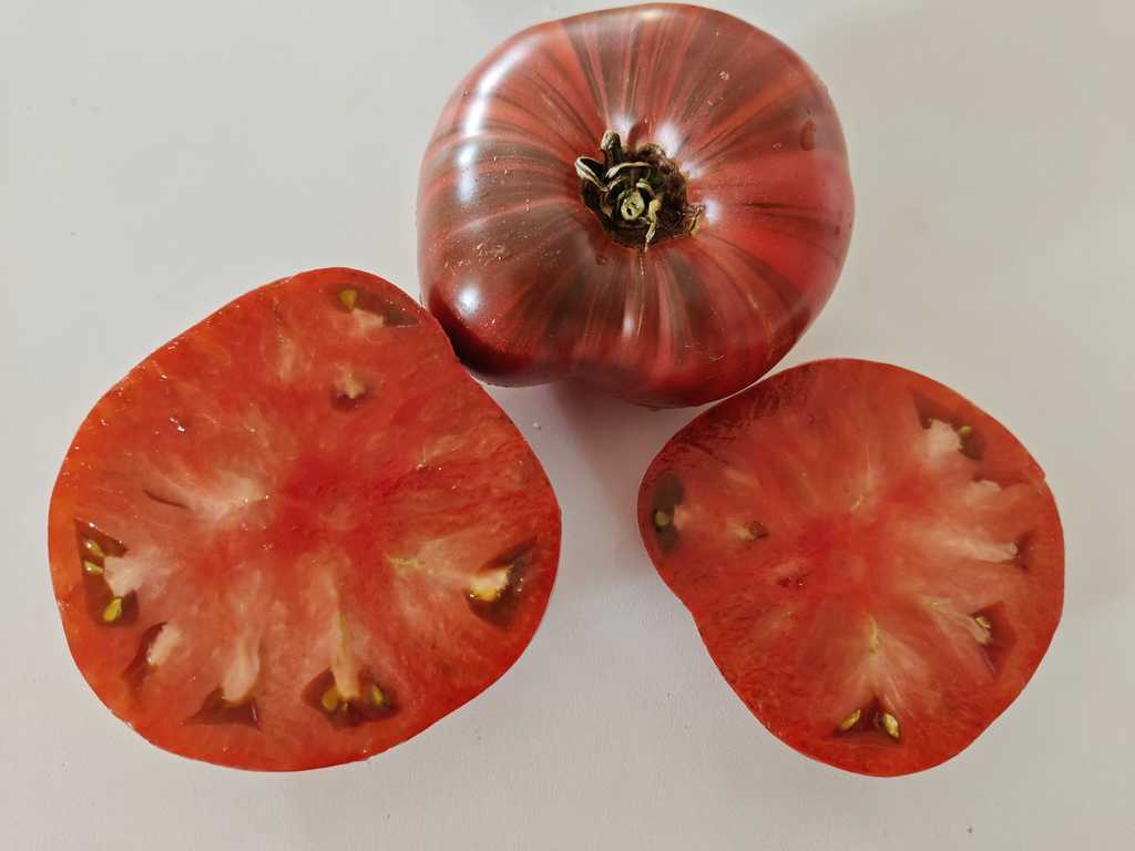 Sorten känd för sina vackert variegerade blad med vita och gröna nyanser. Mörkröda tomater med mörka, ofta randiga axlar har tätt fruktkött och utmärkt, fyllig, lätt rökig tomatsmak.