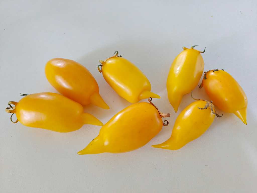 En robust planta som kan uppnå en höjd på 200 cm. Medeltidig sort. Den är otroligt bördig och producerar frukter ända långt in på hösten. Plantan bär solfjäderformade klasar med upp till 20 gul-orangea frukter vardera. Frukterna väger 40-100 gram och har två frökammare. Dem har en oval form med spetsig "näbb". Tomaterna har fast kött och de visar ingen tendens till att spricka så de är idealiska till helkonservering.