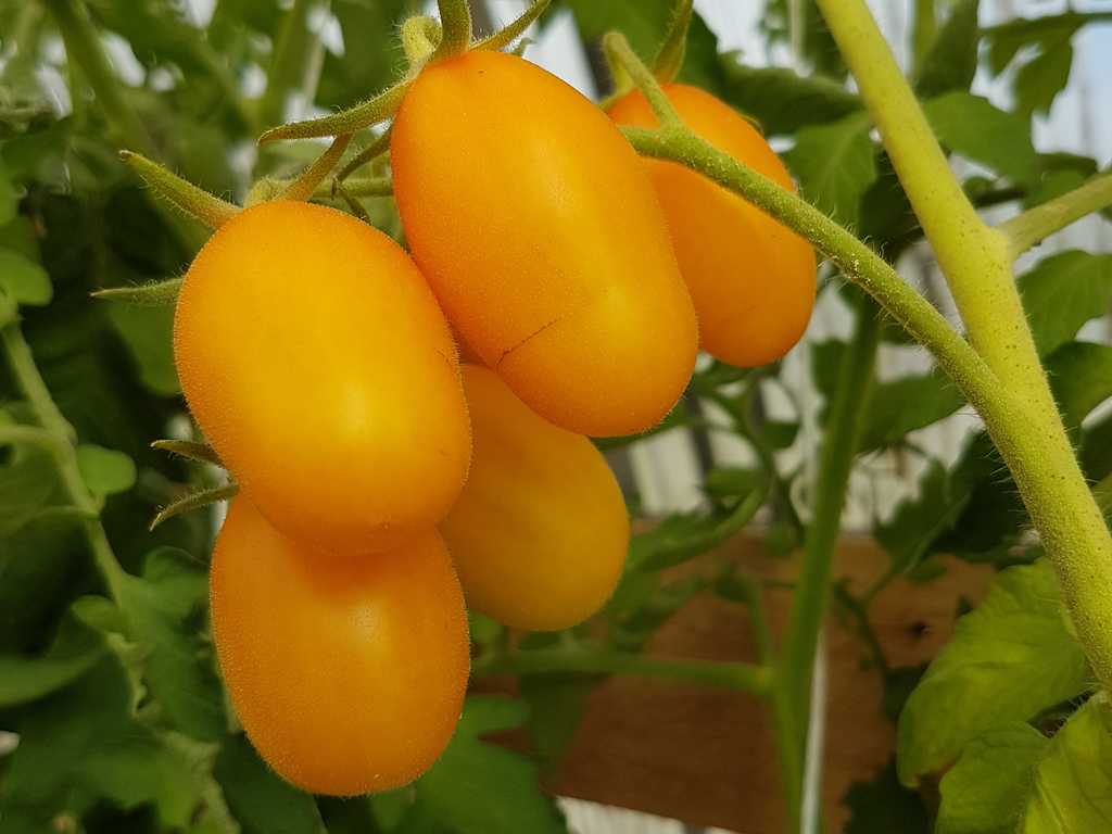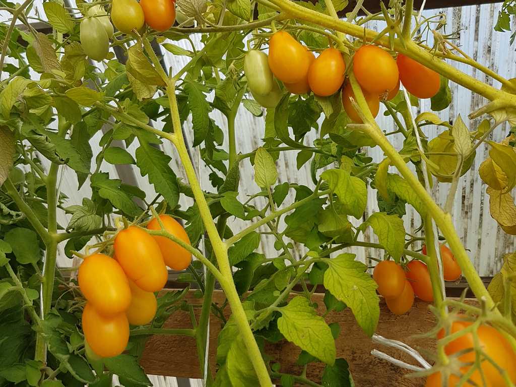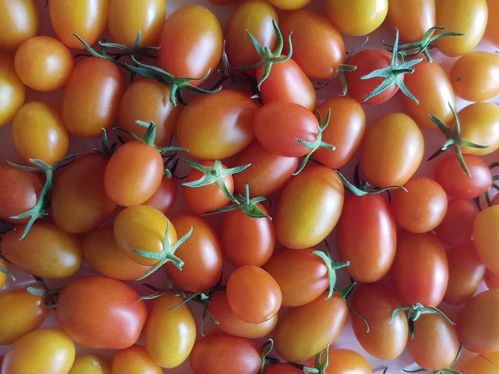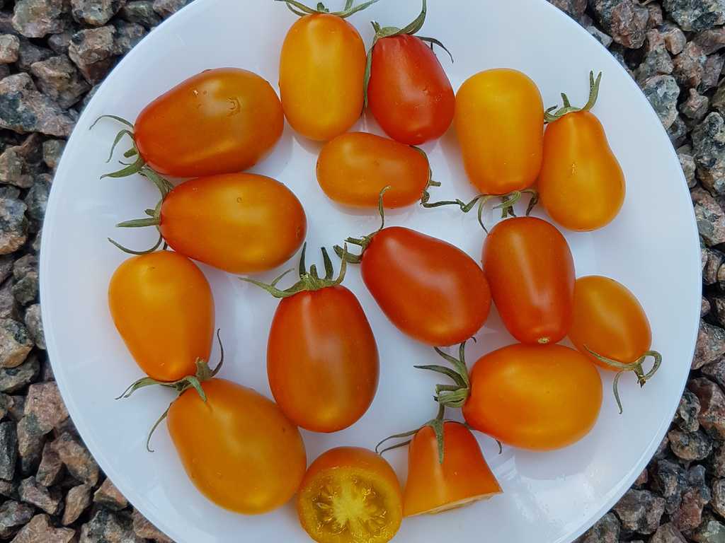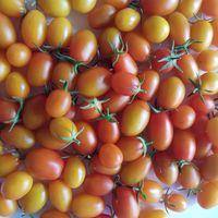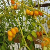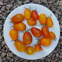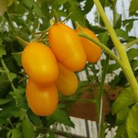 Ultrasweet gul körsbärstomat. Tidig stabil sort, 1,8 m hög, plommonformad frukt, gul-orange färgad, vikt: 30 - 40g. Bär frukt till frost.