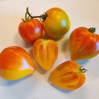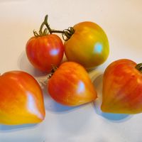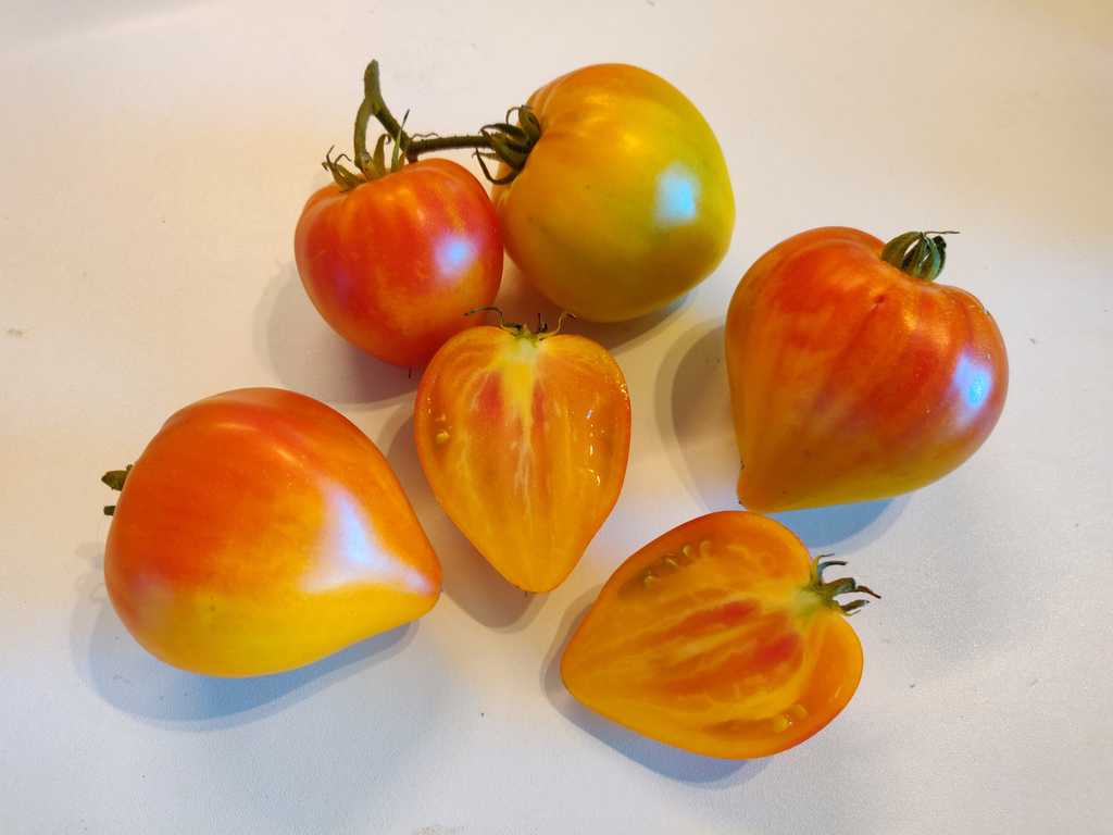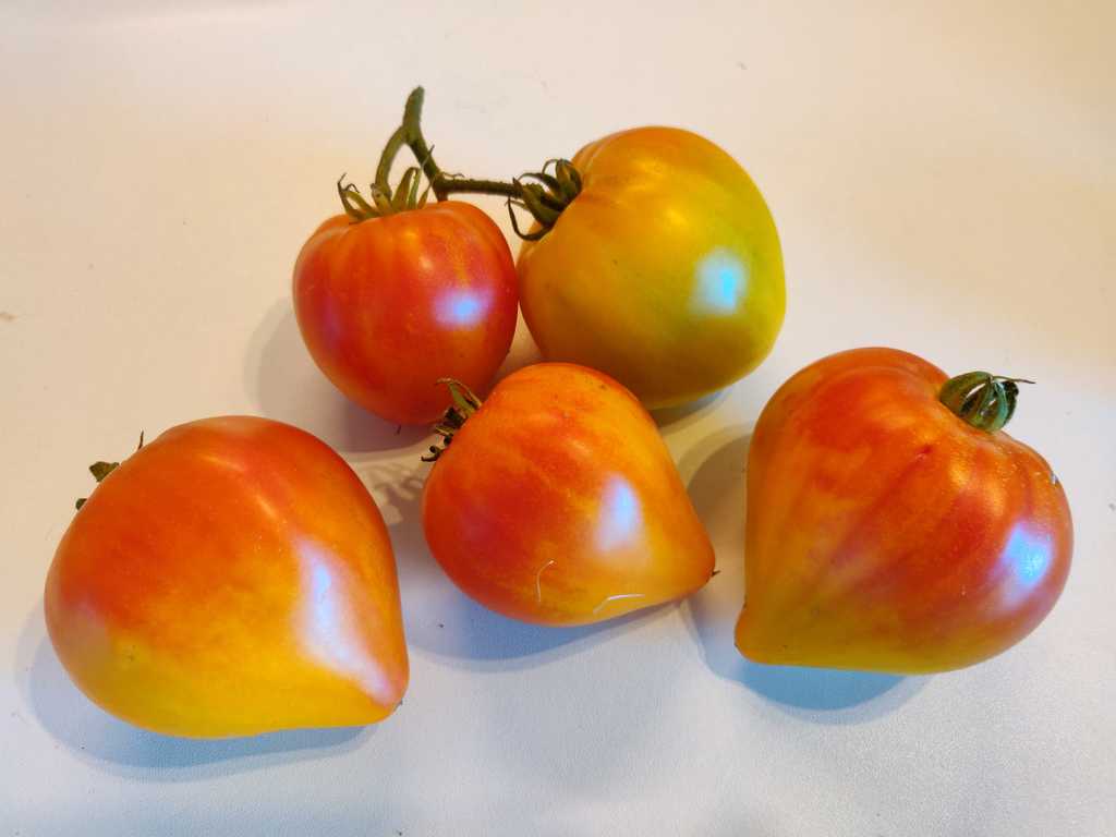 Busken är mycket stark, mycket hög. Busken är upphängd med tofsar med hjärtan. Första tomater är större och rundare, sen kommer mindre tomater och spetsigare. I början är hjärtan bara gula, och vid full mognad blir de två färgade, till slut förvandlas de till röda utvändigt. Massan är tvåfärgad. Mycket produktiv. Smaken är obeskrivlig!!!! En av de godaste tomaterna!!!