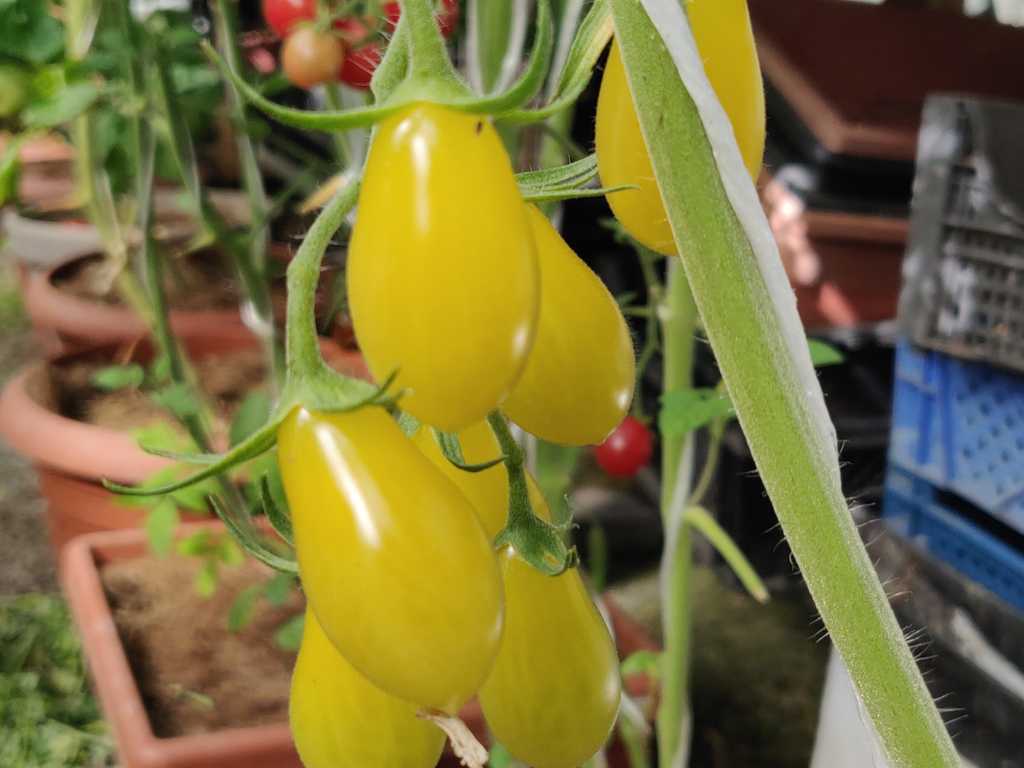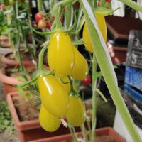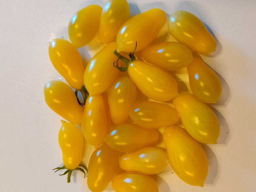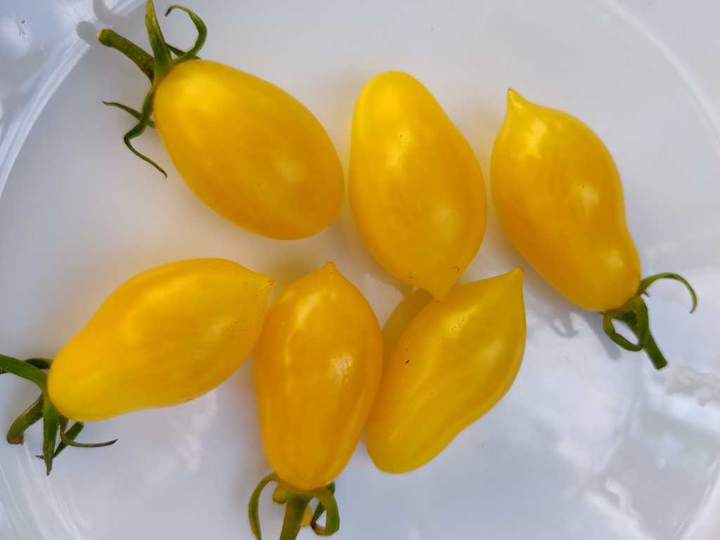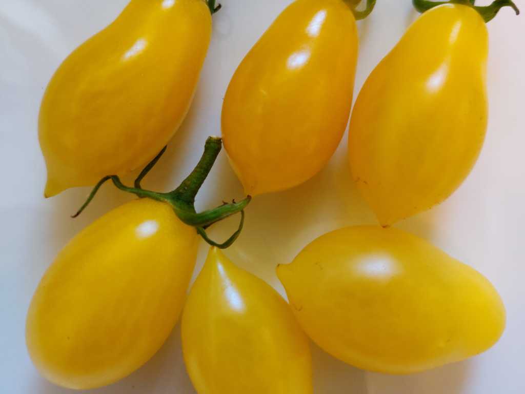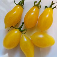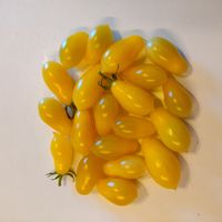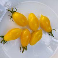 Små avlånga körsbärstomater av dropptyp med en liten spets. Saftigt elfenbensvitt krispigt kött med söt och fruktig smak.