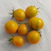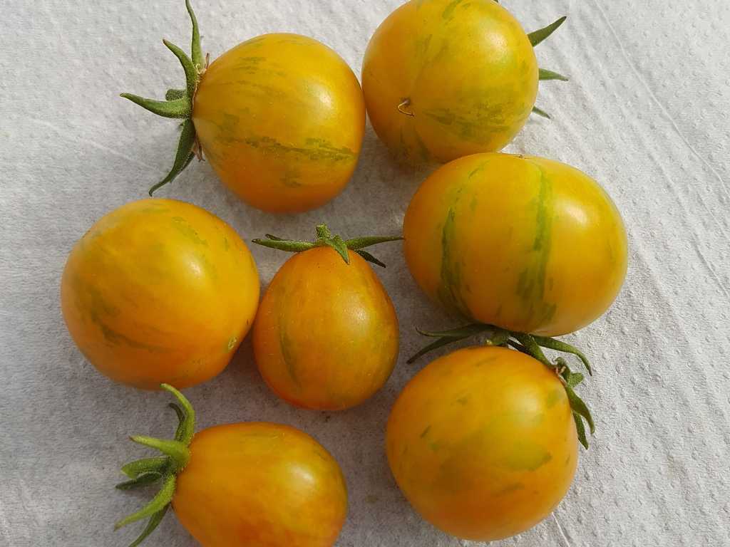 1,8m hög planta, med päronformade små frukter, röda med gula strimmor, goda söta i smaken.