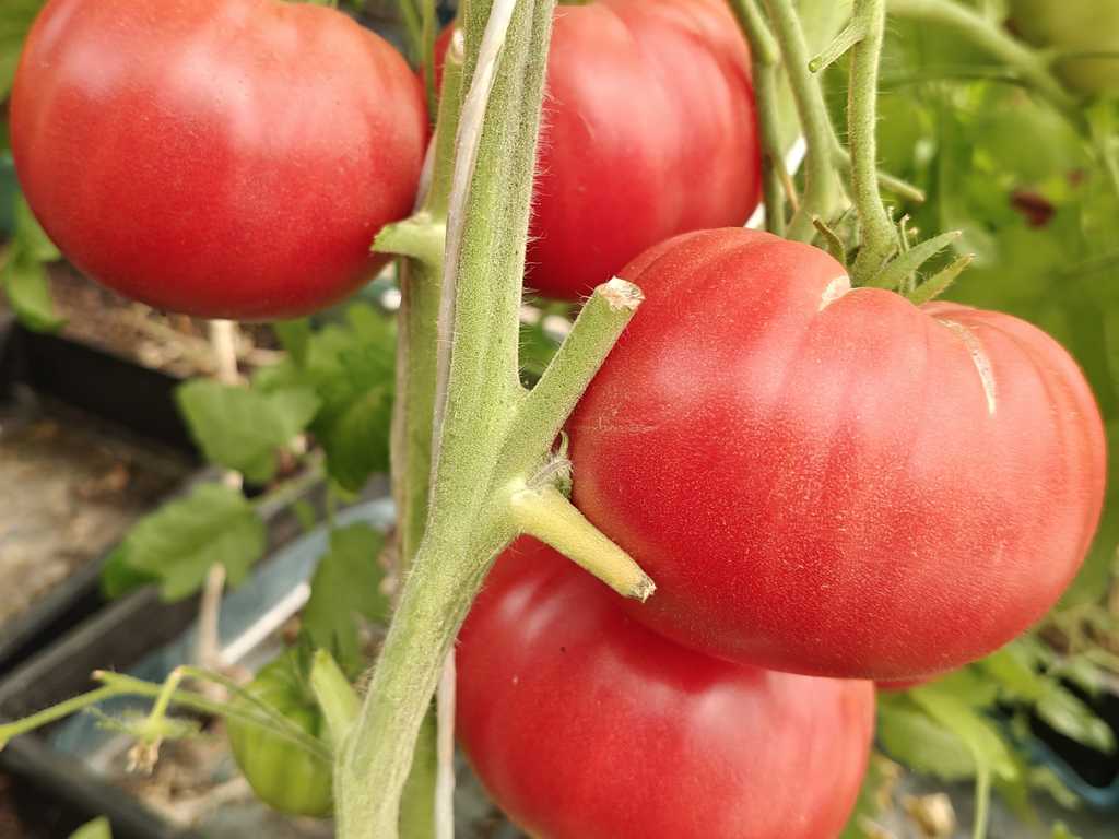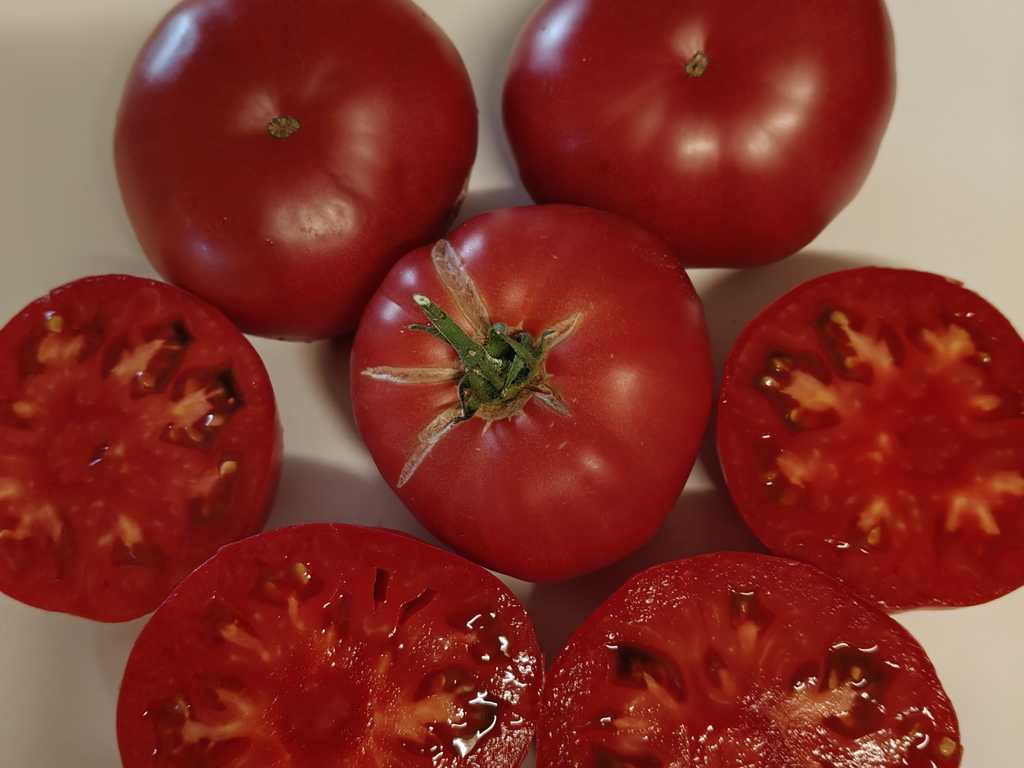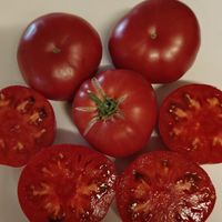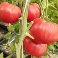 Kraftig planta 2 m hög producerar stora platt-runda hallonrosa tomater, mycket rikgivande. Sjukdomsresistent. Frukter är saftiga och goda!