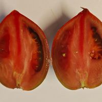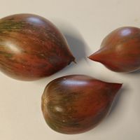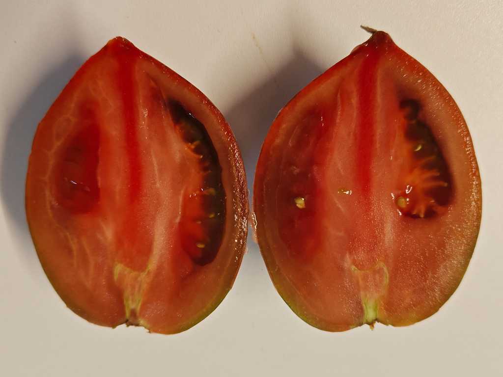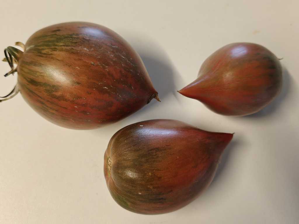 Vackra frukter på 100 till 200 gram, plommonformade ovala med en nippel i toppänden, mörklila färg randig med silvergrå/grön. Saftigt fruktkött. Söt och utsökt smak.