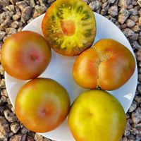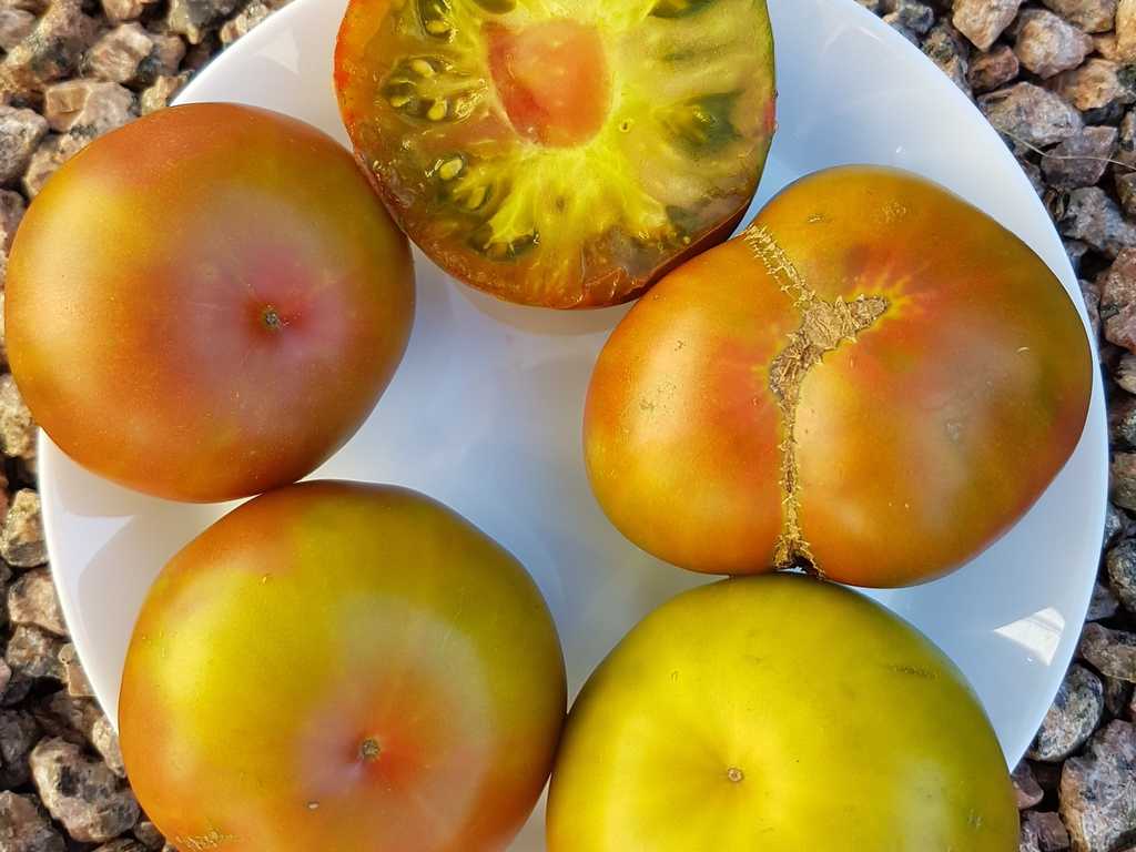 Frukterna är platt-runda, trefärgade, gröna med rödlila fläckar, när tomater är helt mogna für de röd skinn. Frukter har grön saftig kött, utmärkt söt smak, väger 200-300g. Avkastningen är fantastiskt.