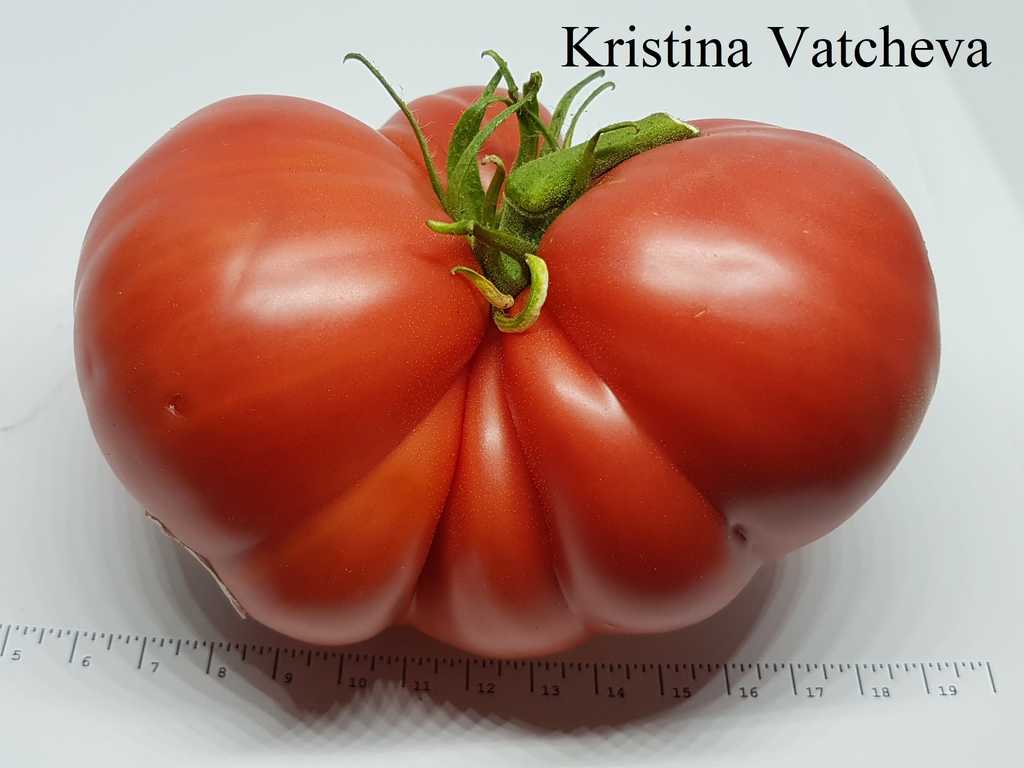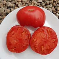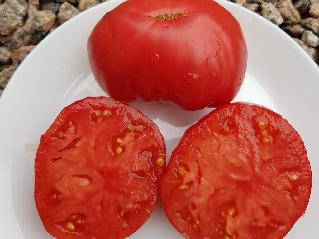 Stor biff-typ frukt som väger 300 till 600 gram, plattrund, ribbad och med fylliga axlar. Hallonrosa skinn med pärlreflektioner. Tätt och köttigt fruktkött, utmärkt söt och aromatisk smak. Kraftig växt med stor utveckling. Generösa skördar från mitten av säsongen.