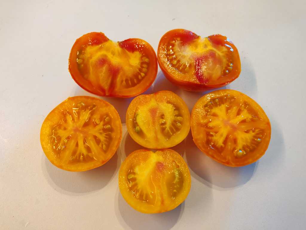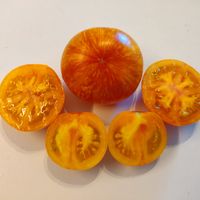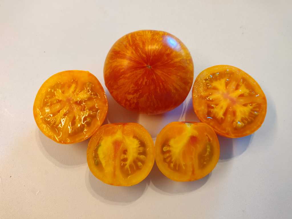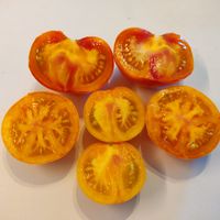 Lavaflödet producerar runda tomater av normal storlek, cirka 60-100 gram vardera, Gula frukter med röda ränder. Frisk och fruktig tomatsmak. Planta växer till ca 200cm i höjd och sprider sig lite breddvis.