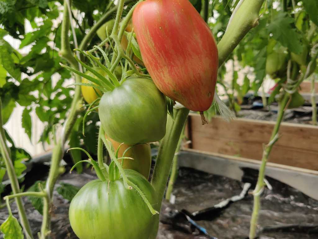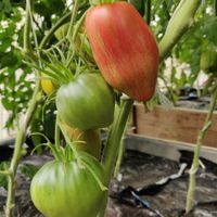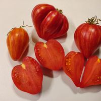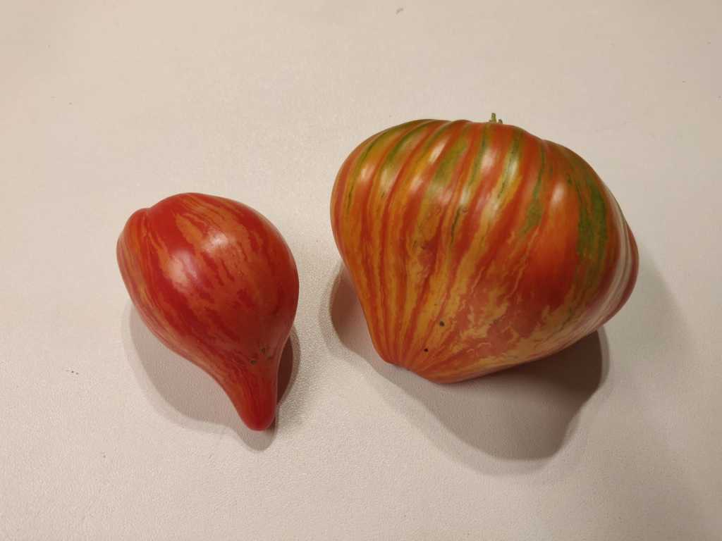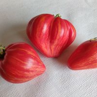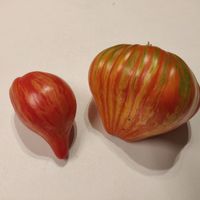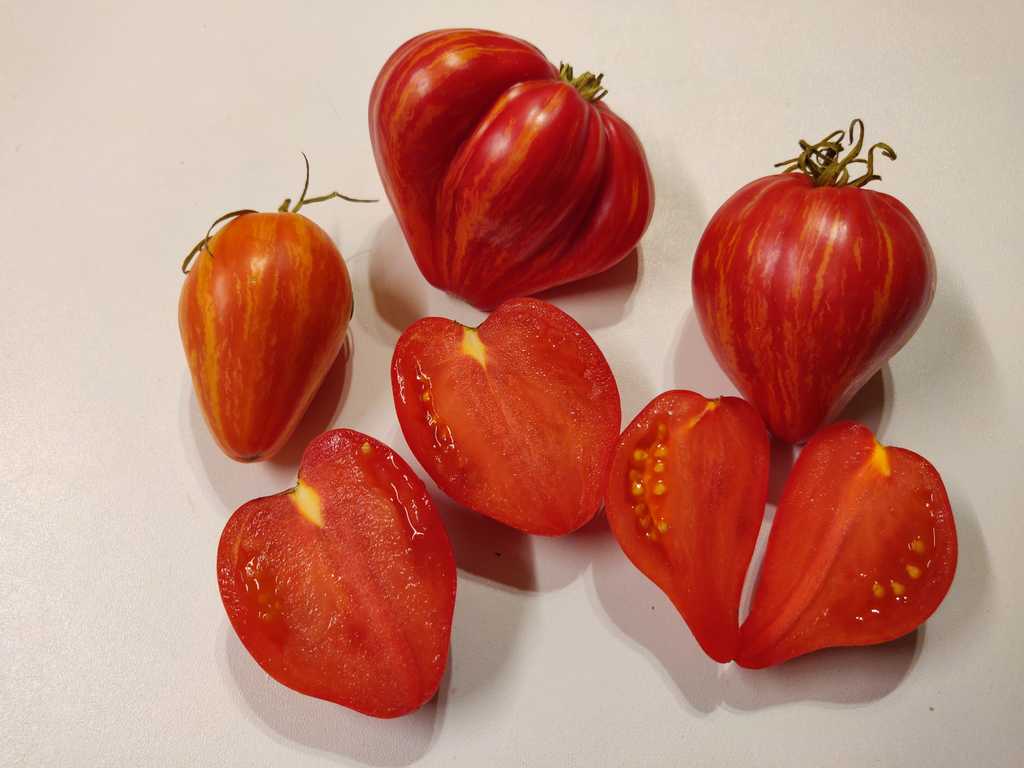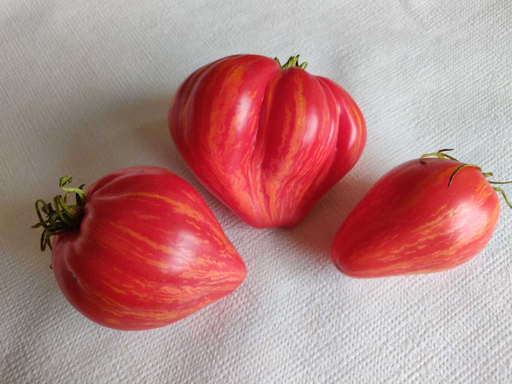 En vacker och ovanlig sort av oxhjärta tomat. Vackert röd-rosa hud strimmig med gult. Mycket tätt rosa kött med få frön. Söt och aromatisk.