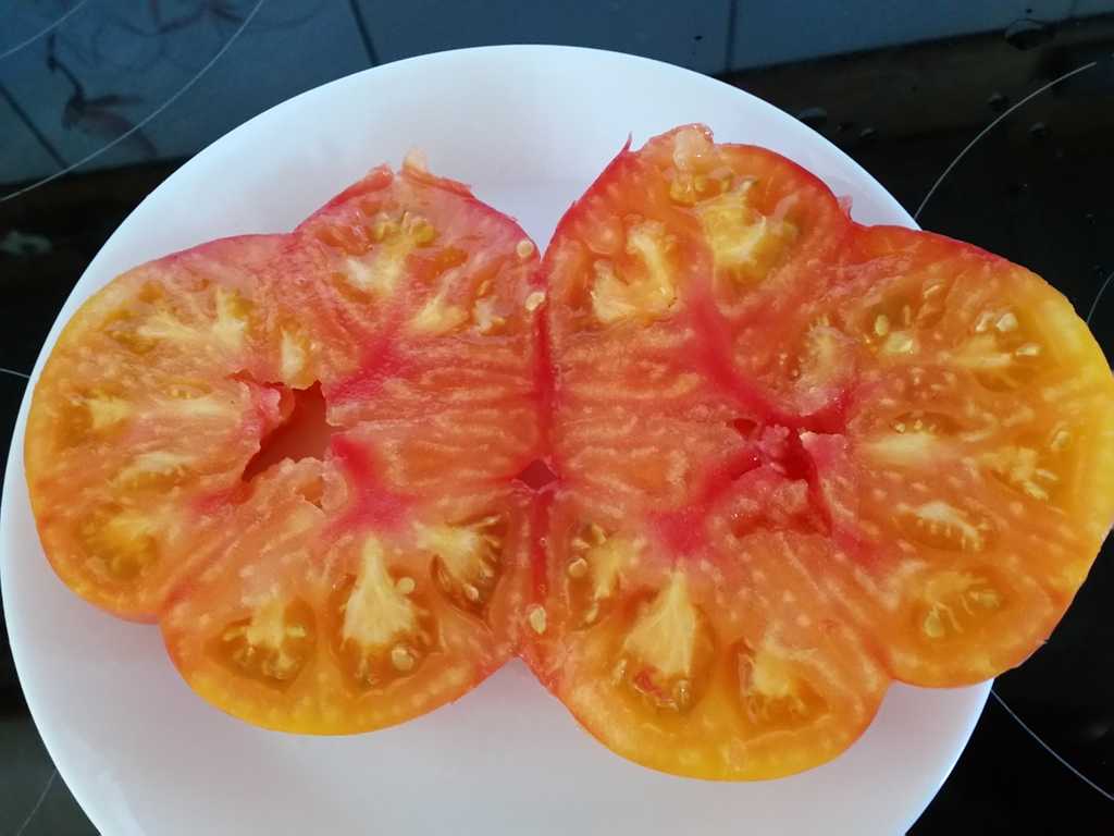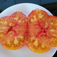 Stor, biffliknande frukt som väger 200 till 500 gram. Tvåfärgad orange-gul och röd, med axlar som växlar från grönt till orange-rött först vid full mognad. Fantastisk smak, komplex, rik och söt.