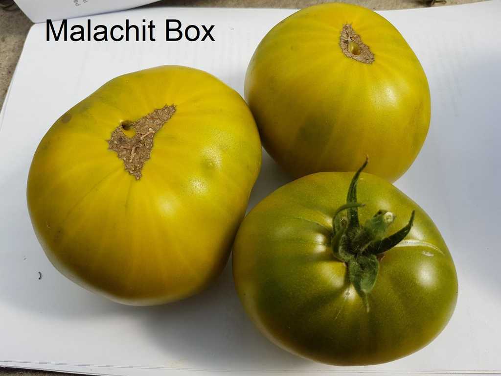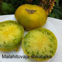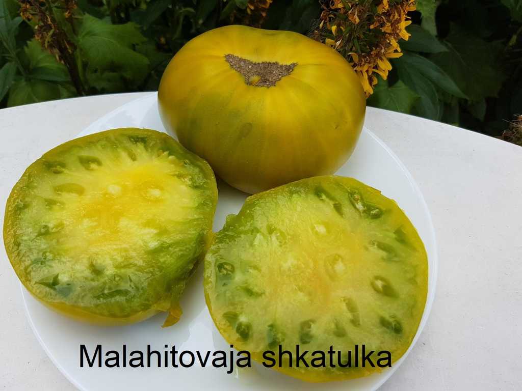 Frukten är platt-rundad, i mognadsstadiet har smaragdgula färgen, stor, väger 200-400 gram (upp till 900 g), köttig, med mjuk kött, söt, utsökt fruktig smak. Dessa tomater är bra för färsk konsumtion och juice.