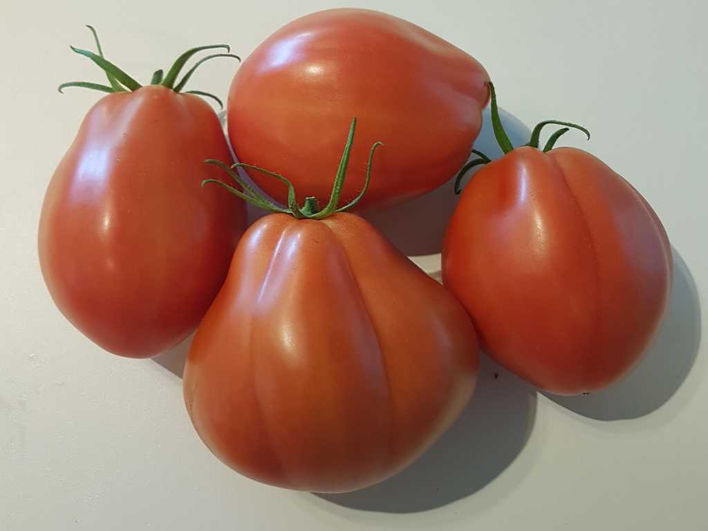 1,7m hög planta, 100-250g frukterna är vackra, lätt korrugerade, stora, fylliga, utan tomrum, med god tomatsmak, utmärkta till sallader och för att göra juicer och såser. En mycket produktiv sort.