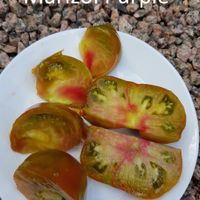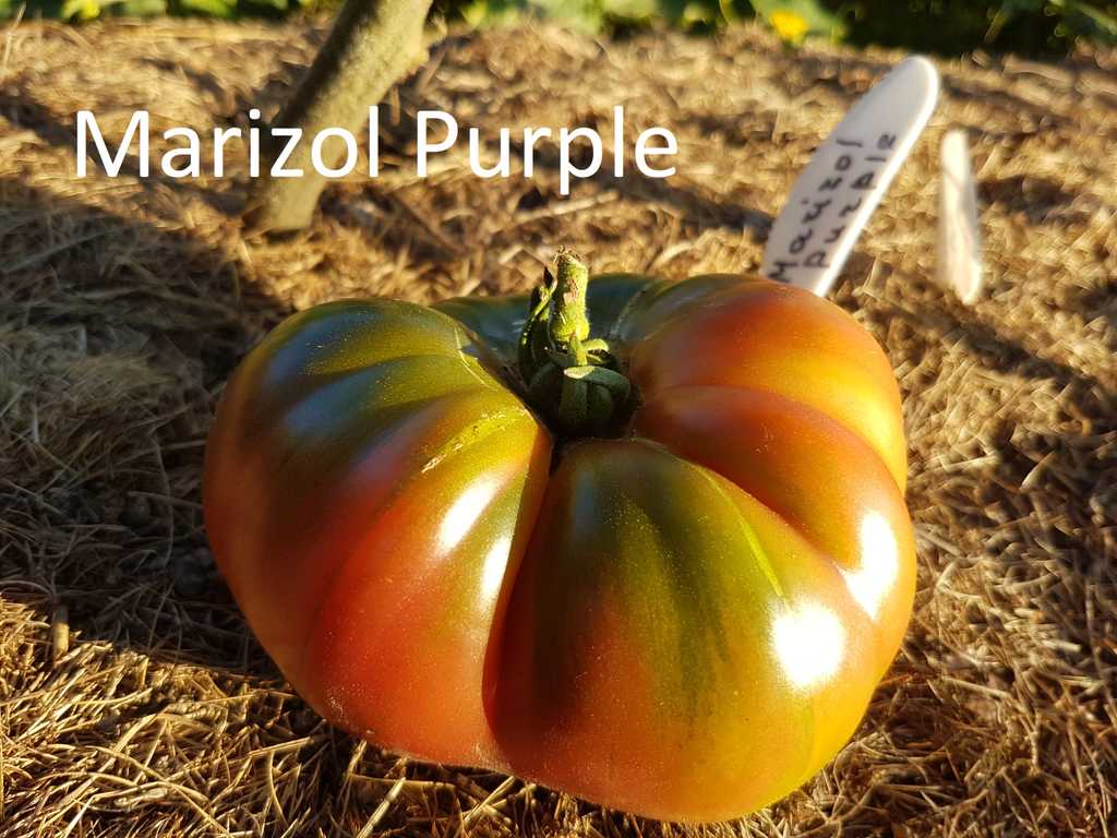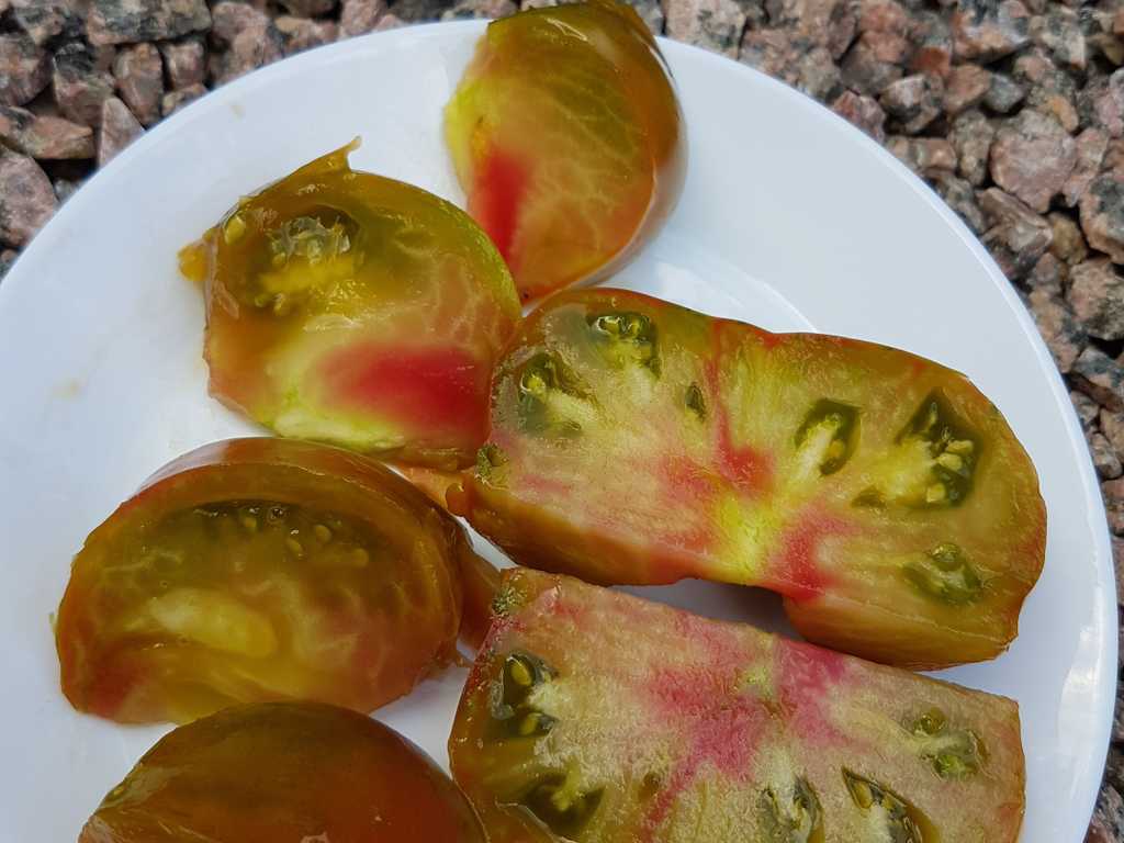 180cm hög. Stora frukter med exotisk färg, brun-gula med mörkrosa rodnad och gröna axlar, har super fin mönster inuti. Väger 250 - 500 gram, rund och räfflad i toppen. Stor fördjupning vid skaftfästet. Tätt och saftigt kött med en söt och fruktig smak. Kraftig växt med hög avkastning. Bra motstånd mot splittring.