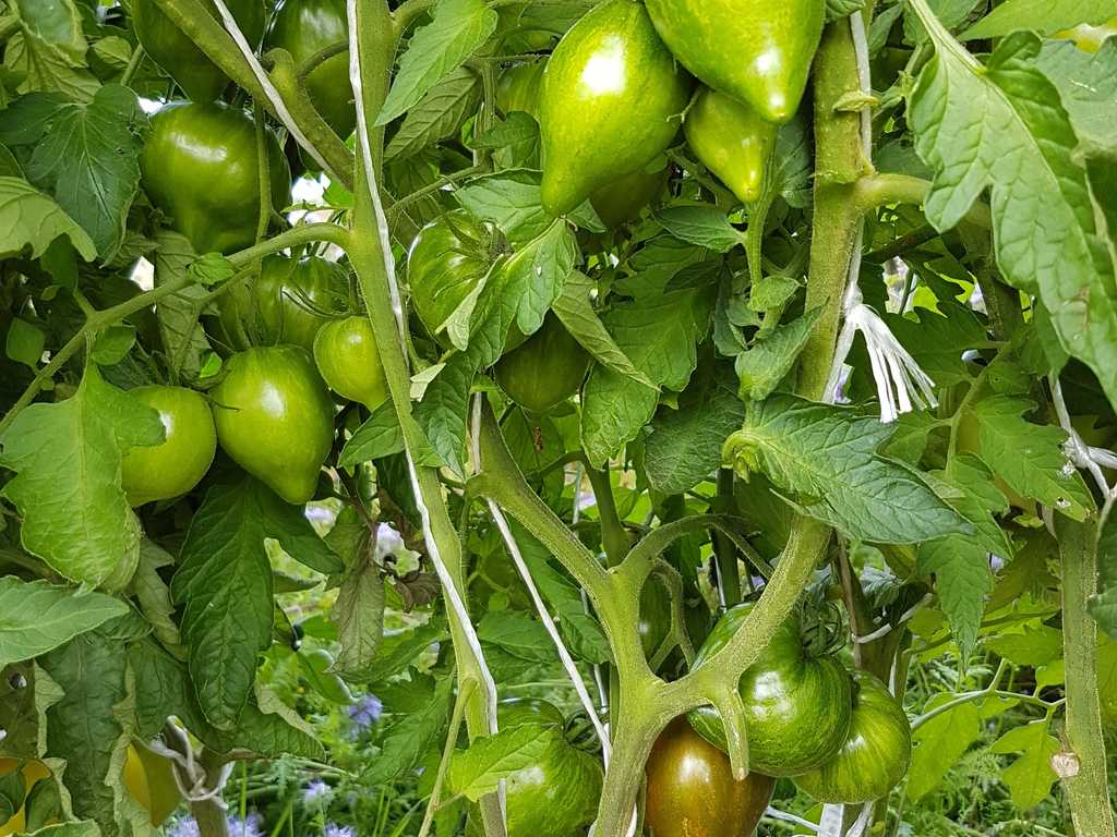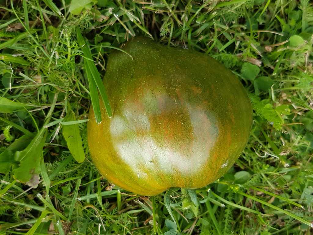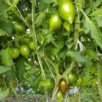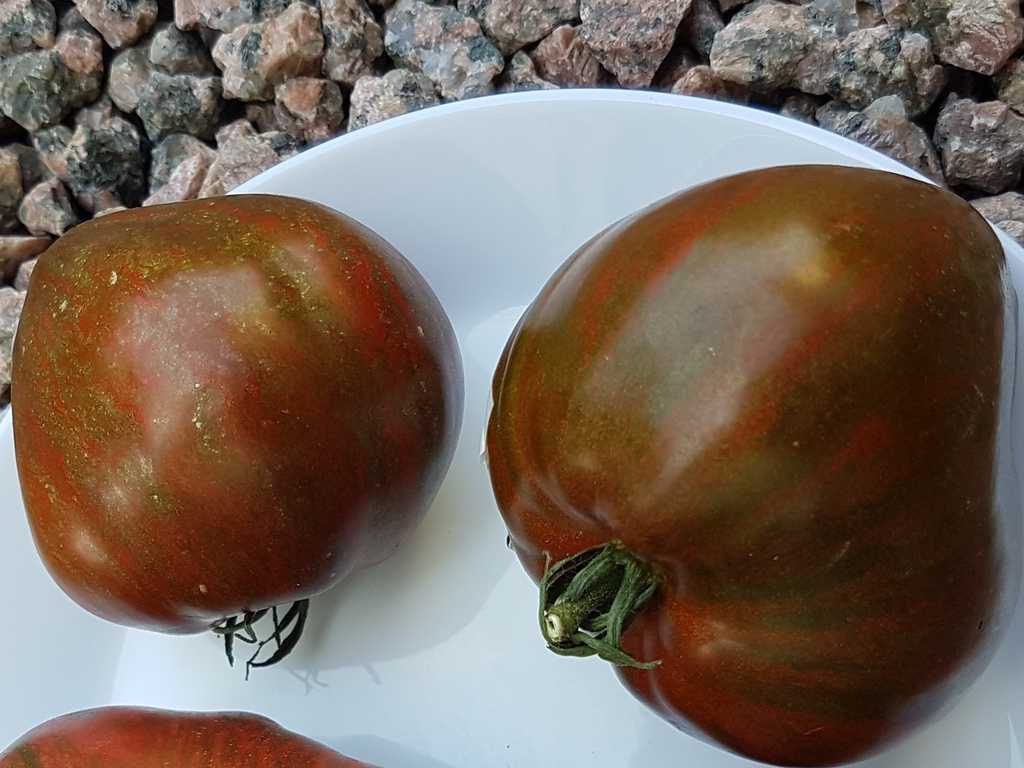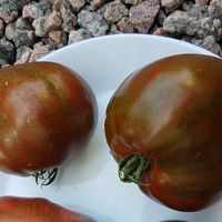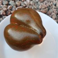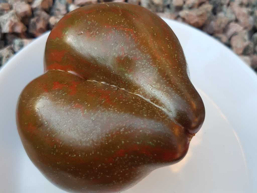 Stora hjärtformade frukter har rödbrun färg med gröna ränder. Fast och saftigt mörkt kött. Fyllig och rik smak. Planta är kraftig och produktiv.