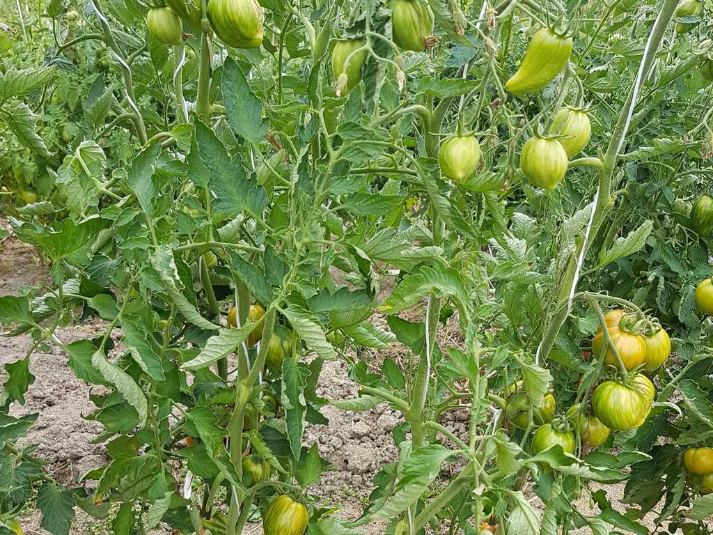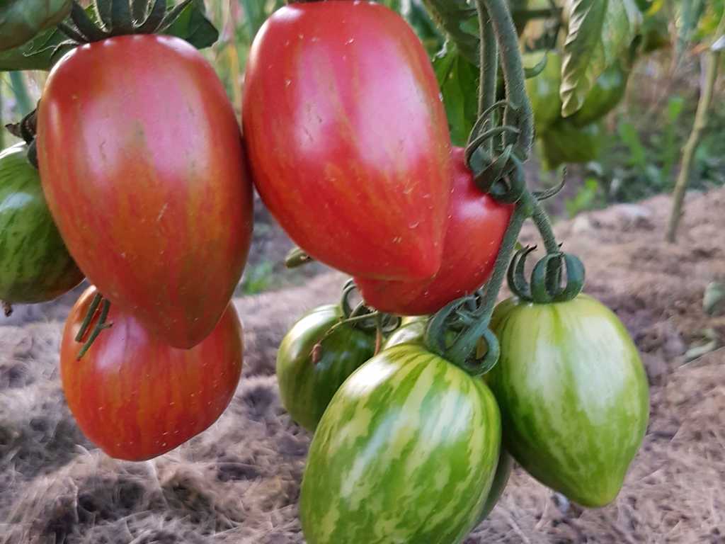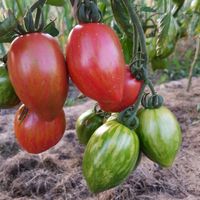 Tidig, 170-190 см hög sort med medelstora avlånga frukter, 100 - 120g, röd/rosa med orange/gula render. Mycket produktiv.