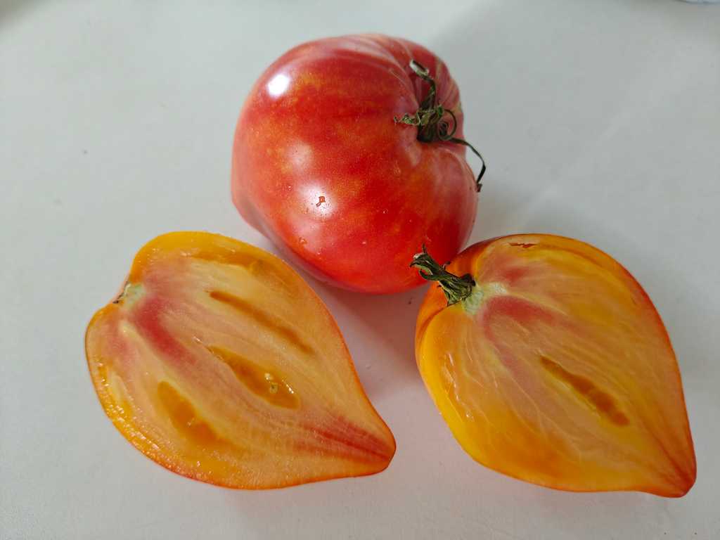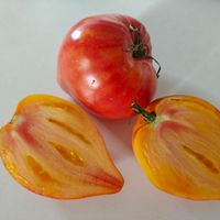 Hjärtformade vackra tvåfärgade gul-orangea frukter med rosa ådror. Lättodlad och tålig sort. Frukter har en rik, söt och syrlig smak. Sorten är framtagen av Karen Olivier.