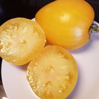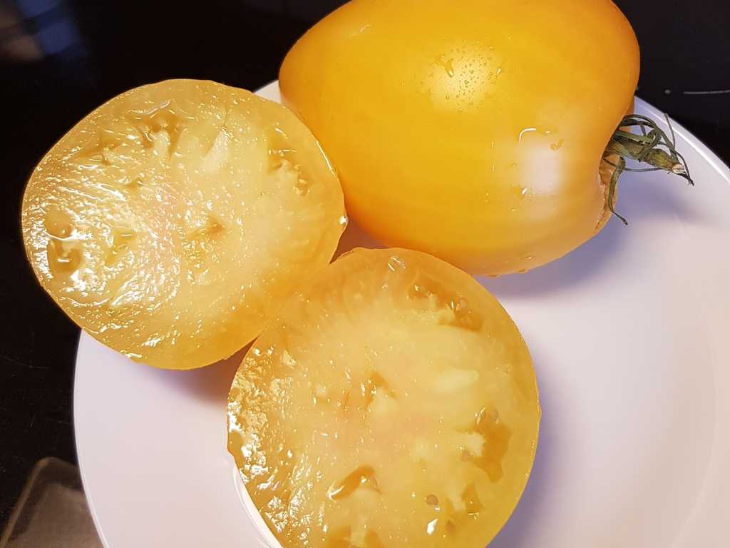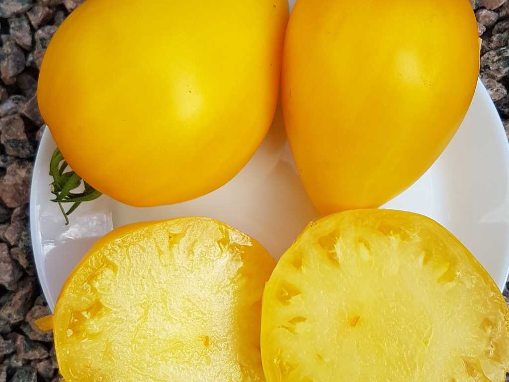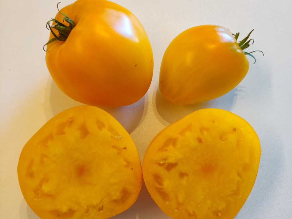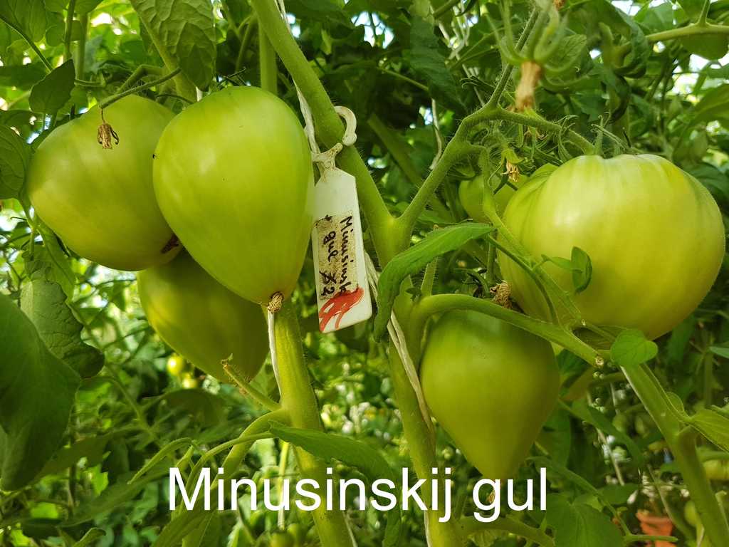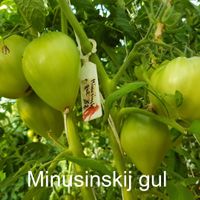Bychje serdze Minusinskoje zoltoje. Minusinski Sibiriska sorter är kända för sin härdighet, kan växa i kallare klimat, har hög resistens mot de flesta sjukdomar . Just den sort har kraftig hög planta (upp till 2m) med citron-gula hjärtformade stora frukter 200-400g. Tomater är köttiga med god välbalanserad smak.