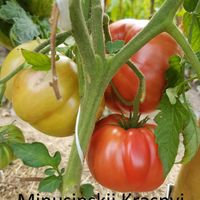 Minusinski - Sibiriska sorter är kända för sin härdighet, kan växa i kallare klimat, har hög resistens mot de flesta sjukdomar. Kraftig stor planta med extra stora frukter. Röda köttiga tomater som väger 300-400 g, saftiga, smakrika, med bra sötma och balanserad syra, utmärkt tomatsmak. Mycket produktiv sort!