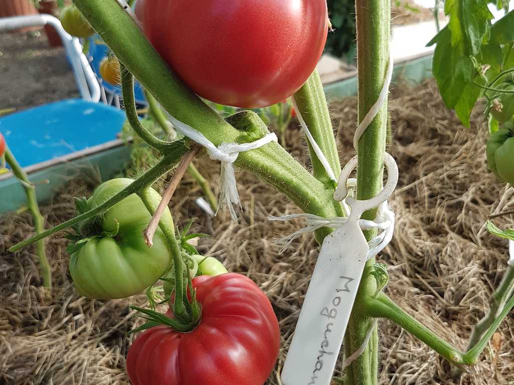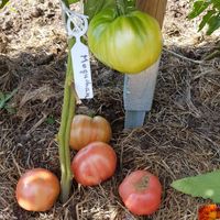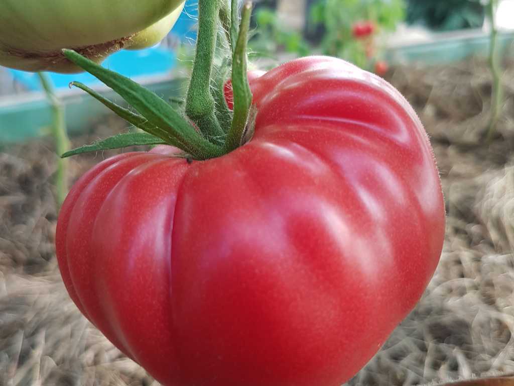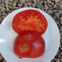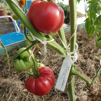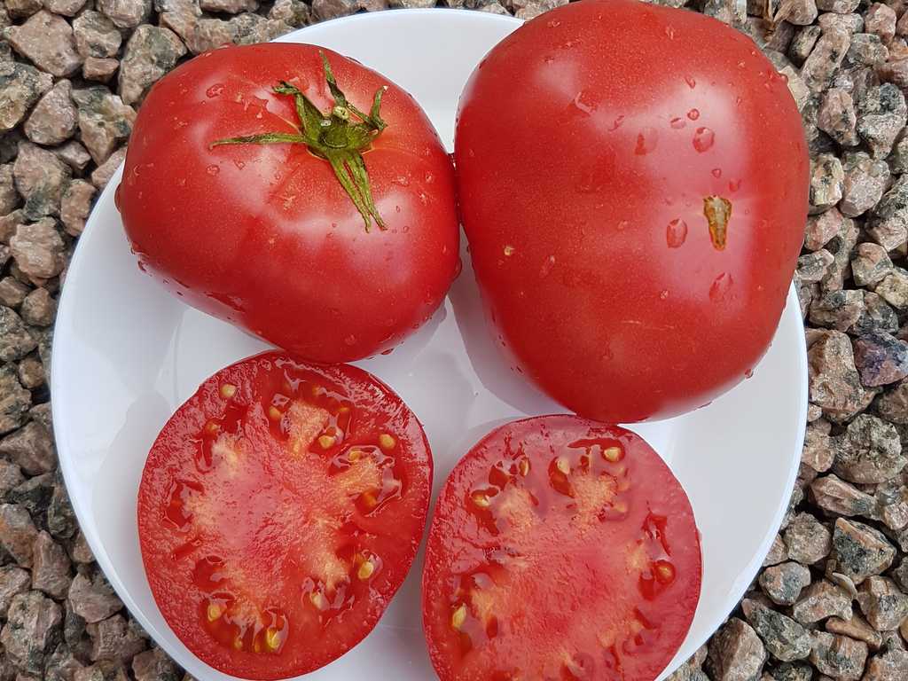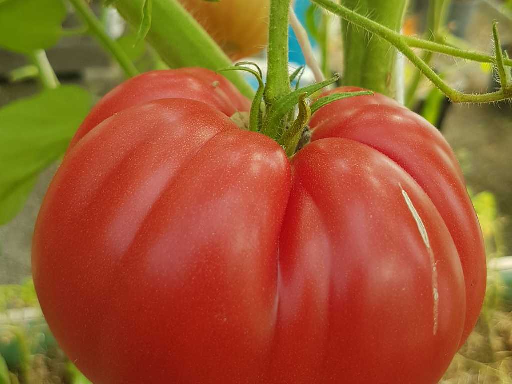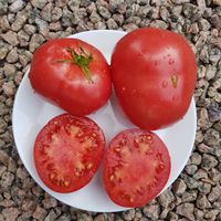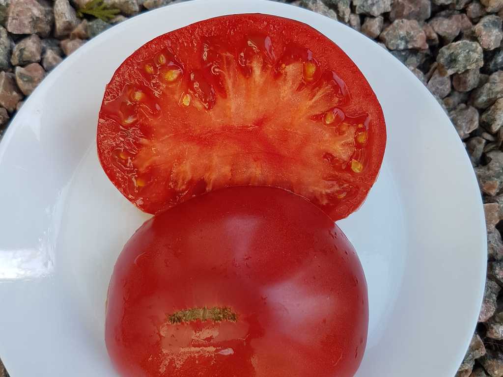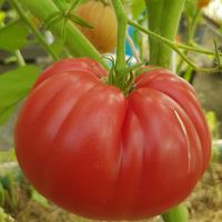 Extra stora frukter, kraftig växtsätt, 2,5m hög planta. Tomaterna är hallonfärgade, plattrunda, tjocka och bredaxlade. Tät, köttig, med extremt välsmakande vattenmelonmassa utan ådror.