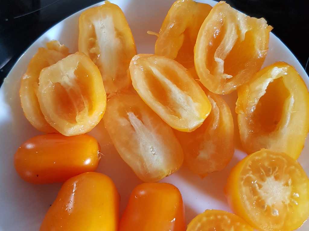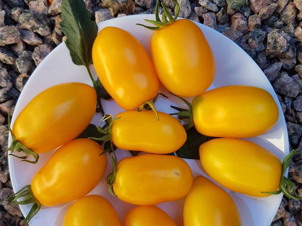 Tidig sort, 50-70 cm hög buske, producerar gula plommontomater. De är väldigt söta och smakrika. Den har en hög sockerhalt och speciell smak. Perfekt för sallader och snacks.