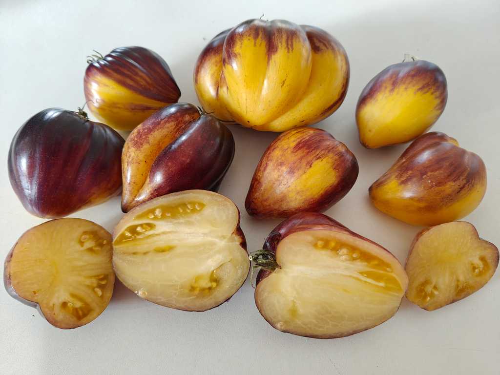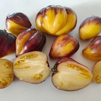 Mycket vacker sort från Sofia Saakova. Hjärtformade frukter i olika storlekar, gul/blå-lila utsidan och gula inuti, söt fruktig smak. Planta är 1,8m hög, mycket rikgivande, fruktvikt - 100-250g.