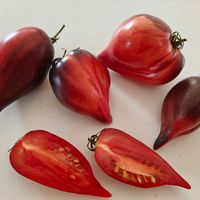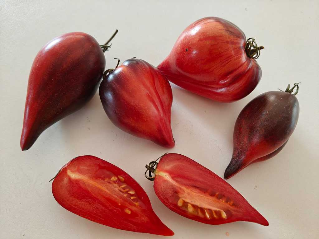 Sofia Saakova sort. Frukterna har långa, spetsiga nosar och väger 100–300 g. De är mycket vackra, rosa och övergår i eldigt scharlakansrött med ränder och hornpenseldrag. Busken är en fröjd när frukterna börjar mogna. Fruktköttet är sött, tätt oc saftigt.