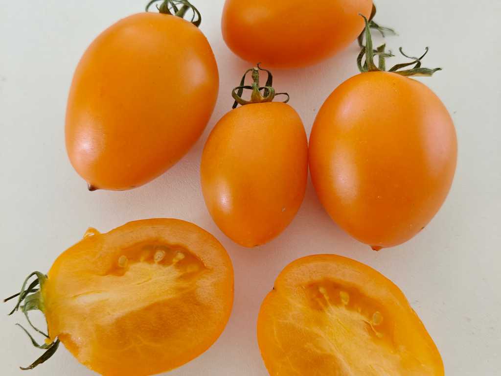 Plommontomat med vackert orange färg och intensiv smak. Köttiga frukter med låg syra gör den perfekt till tomatsås, inläggningar och varma rätter. En underbar sort att odla tomater hemma med färgprakt.