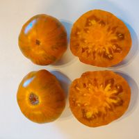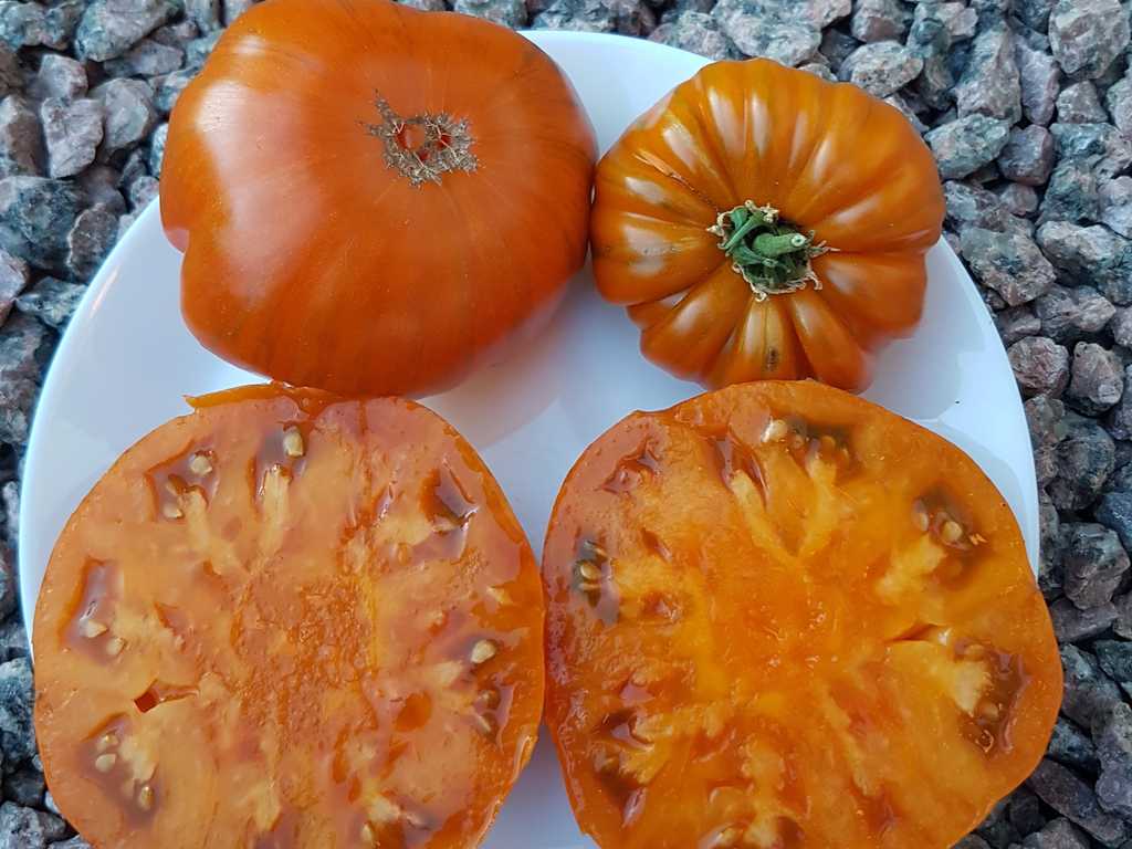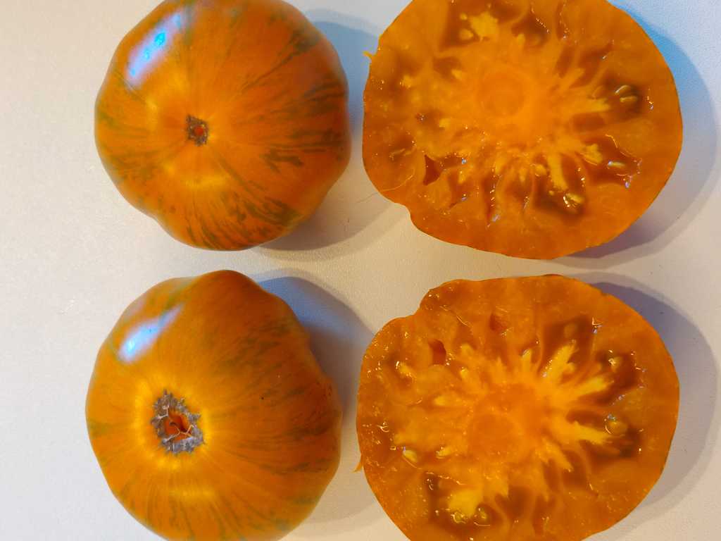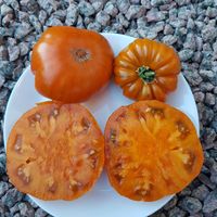 1,5m hög planta. Frukter har mycket ovanlig färg: mörkorange gröna/bärnstensfärgade övertoner, nästan ockra, tillplattad form, väl markerad ribb i toppen. Biffigt kött med utmärkt smak. (Tom Wagner)